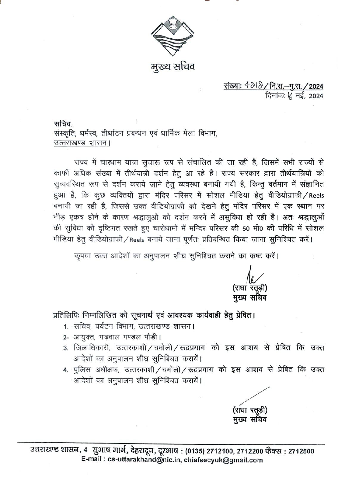 चारों धामों में रील्स बनाने और वीडियोग्राफी बनाने पर 50 मीटर के भीतर प्रतिबंध