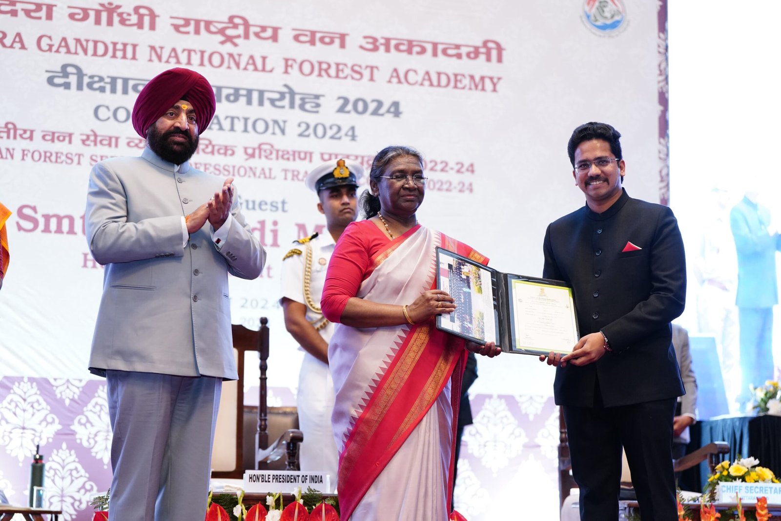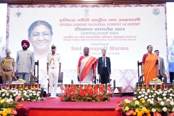 देहरादून : राष्ट्रपति द्रौपदी मुर्मु ने इन्दिरा गांधी राष्ट्रीय वन अकादमी, देहरादून में प्रशिक्षणरत व्यावसायिक प्रशिक्षण पाठ्यक्रम के भारतीय वन सेवा के परिवीक्षार्थियों के दीक्षांत समारोह में प्रतिभाग किया। इस अवसर पर राष्ट्रपति ने परिवीक्षार्थियों को प्रमाण पत्र और पदक प्रदान किये।