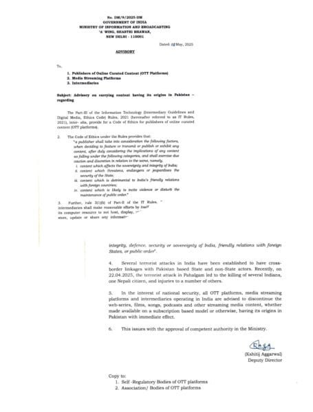 नई दिल्ली : राष्ट्रीय सुरक्षा के मद्देनज़र भारत सरकार ने बड़ा फैसला लेते हुए सभी ओटीटी प्लेटफॉर्म्स, मीडिया स्ट्रीमिंग सेवाओं और संबंधित मध्यस्थों को पाकिस्तान से जुड़े मूल कंटेंट को तत्काल प्रभाव से बंद करने का निर्देश जारी किया है। यह आदेश सूचना और प्रसारण मंत्रालय की ओर से जारी किया गया है।