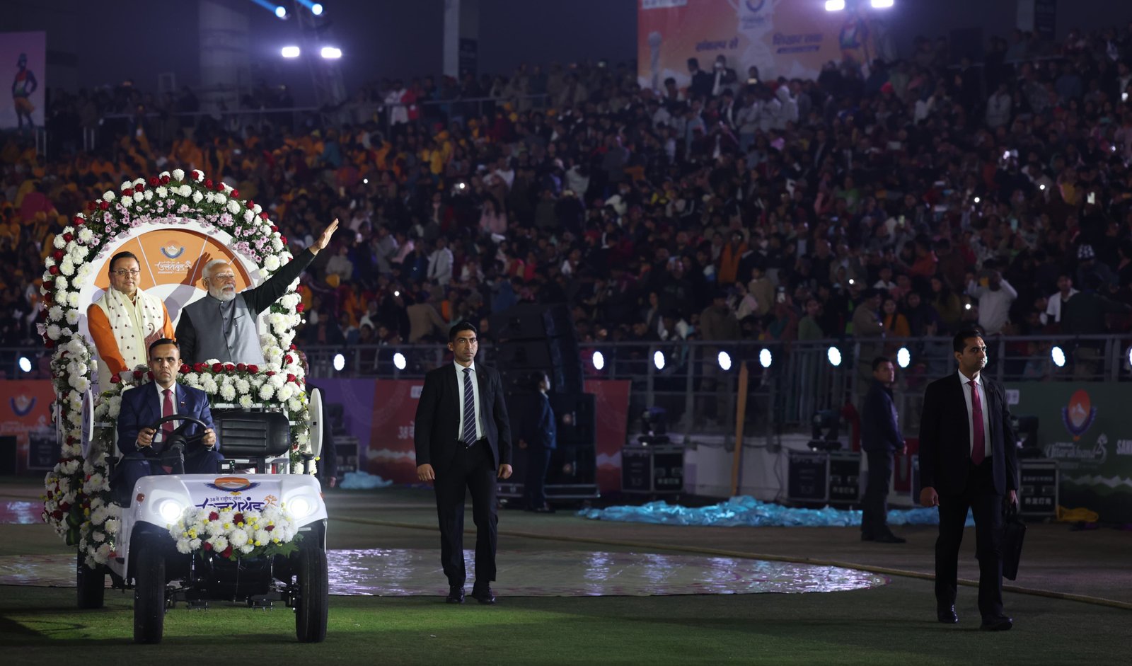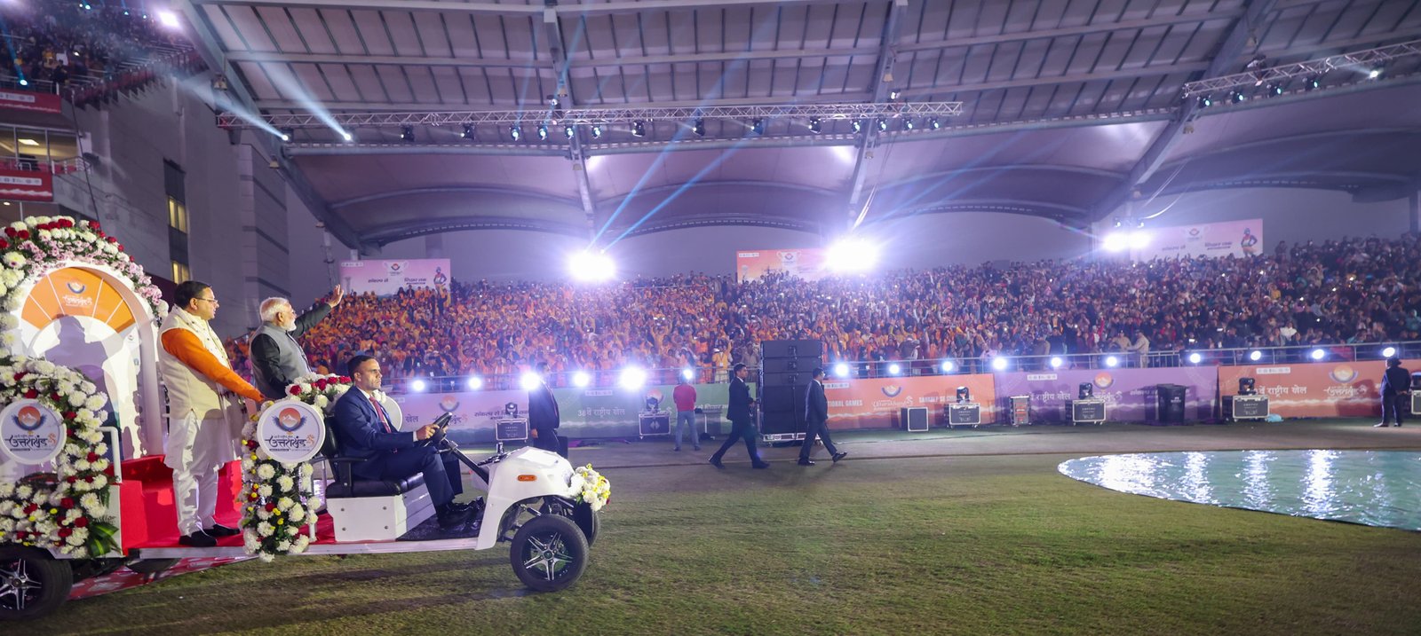 तय कार्यक्रम के मुताबिक प्रधानमंत्री नरेंद्र मोठी ठीक छह बजे, राष्ट्रीय खेलों का उद्घाटन करने, मैदान में पहुंचे। प्रधानमंत्री ने सबसे पहले गोल्फ कार्ट में स्टेडियम का राउंड लिया, गोल्फ कोर्ट पर उनके साथ मुख्यमंत्री पुष्कर सिंह धामी भी थे। इस दौरान उन्होंने खिलाड़ियों और दर्शकों का हाथ हिलाकर अभिवादन किया। जिस पर उपस्थित जनसमुदाय ने भी तालियों की गड़गड़ाहट के साथ प्रधानमंत्री का स्वागत किया। करीब आधे घंटे तक चले सांस्कृतिक कार्यक्रम के बाद, उत्तराखंड की खेल मंत्री रेखा आर्य और भारतीय ओलंपिक संघ की अध्यक्ष और सांसद डॉ पीटी ऊषा ने स्वागत भाषण दिया।