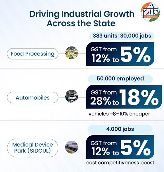 • जीएसटी 28% से घटाकर 18% करने से ऑटो उद्योग को बढ़ावा मिला है, जिससे वाहन 8-10% सस्ते हो गए हैं और 50,000 नौकरियों को बढ़ावा मिला है।