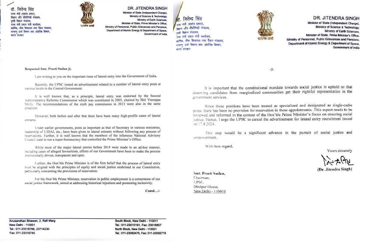 जितेंद्र सिंह ने चिट्ठी में कहा है कि सैद्धांतिक तौर पर सीधी भर्ती की अवधारणा का समर्थन 2005 में गठित प्रशासनिक सुधार आयोग की तरफ से किया गया था, जिसकी अध्यक्षता वीरप्पा मोइली की तरफ से की गई थी। हालांकि, लेटरल एंट्री को लेकर कई हाई-प्रोफाइल मामले सामने आए हैं।