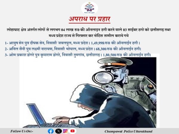 चम्पावत : लोहाघाट क्षेत्र अंतर्गत लोगों से लगभग 04 लाख रूपये की ऑनलाइन ठगी करने वाले 03 साईबर ठगो को छत्तीसगढ़ तथा मध्य प्रदेश राज्य से गिरफ्तार कर नोटिस तामील कराये गये।  पुलिस अधीक्षक जनपद चम्पावत अजय गणपति के निर्देशानुसार तथा पुलिस उपाधीक्षक चम्पावत /टनकपुर के पर्यवेक्षण में जनपद चम्पावत में ऑनलाईन ठगी करने वाले अभियुक्तों के विरूद्ध कार्यवाही किये जाने हेतु निर्देशित किया गया है।