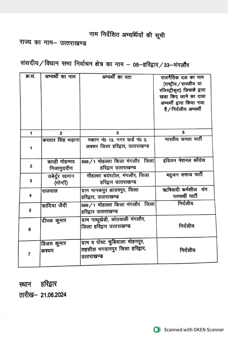 मंगलौर विधानसभा सीट पर उप चुनाव के लिए 07 प्रत्याशियों किये नामांकन