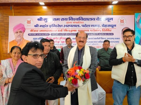 देहरादून। श्री गुरु राम राय विश्वविद्यालय एवं श्री महंत इन्दिरेश अस्पताल, देहरादून के सौजन्य से सोवन सिंह नेगी, सामुदायिक भवन, नरेन्द्र नगर में शनिवार, 29 नवम्बर 2025 को कैंसर जागरूकता एवं निःशुल्क स्वास्थ्य परीक्षण शिविर का सफल आयोजन किया गया। इस अवसर पर 1880 मरीजों ने शिविर का लाभ उठाया। शिविर में अस्पताल के विशेषज्ञ चिकित्सकों ने स्वास्थ्य परामर्श दिया तथा रोगियों को निःशुल्क दवाइयाँ वितरित की गईं।