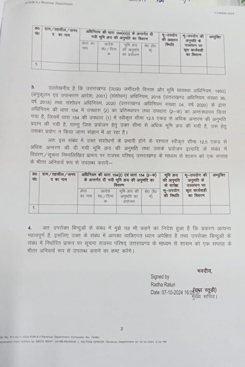 देहरादून : मुख्य सचिव राधा रतूड़ी ने सभी जिलों से 250 वर्ग मीटर से अधिक भूमि खरीद का ब्योरा तलब किया है। साथ ही 12.50 एकड़ से अधिक भूमि के उपयोग का भी ब्योरा मांगा है। मुख्य सचिव ने सात दिन के भीतर इसकी रिपोर्ट मांगी है। कि बता दें कि सीएम ने चार जिलों के बारे में रिपोर्ट मांगी थी। लेकिन अब जांच का दायरा बढ़ा दिया गया है। नियमों के विपरीत भूमि होने पर सारी भूमि सरकार में निहित होगी।