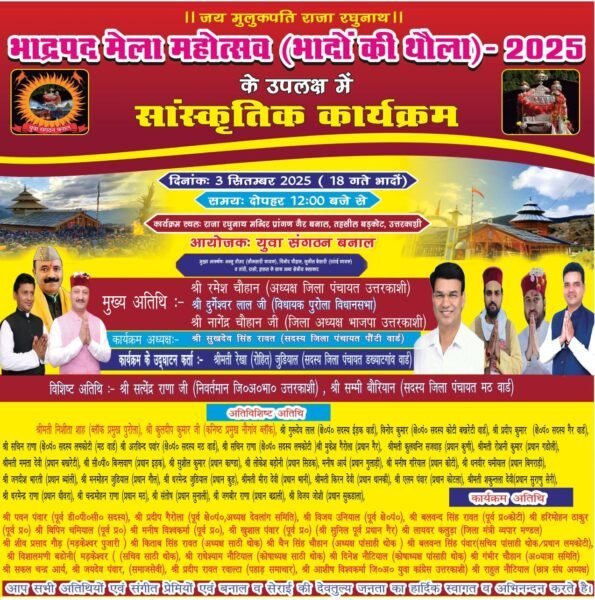 यह सालाना भाद्रपद मेला महोत्सव (भादों कु थौलु) दोपहर 12 बजे से शुरू होगा। इस दौरान, उत्तराखंड के लोक गायक अज्जु तोमर, विनोद चौहान और सुनील बेसारी समेत रवांई, जौनपुर और जौनसार के लोक कलाकार अपनी प्रस्तुतियां देंगे।