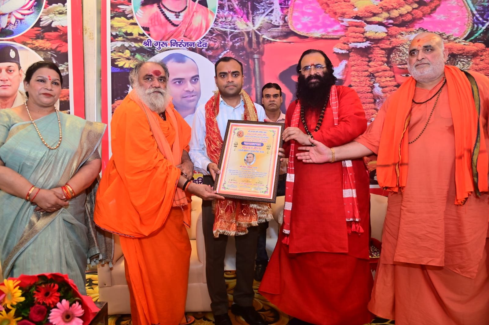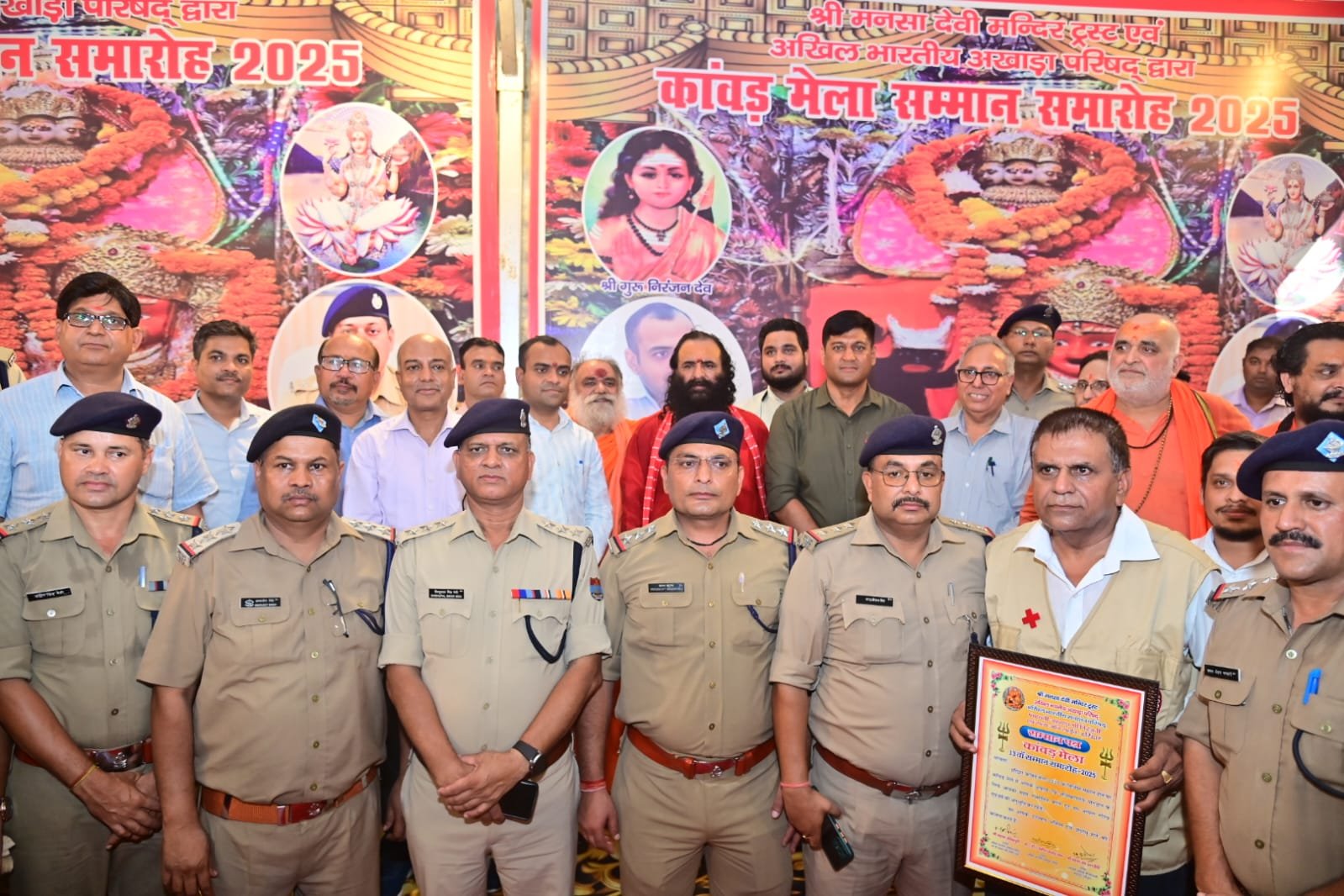 हरिद्वार : पंचायती अखाड़ा श्री निरंजनी के श्री मनसा देवी चरण पादुका मंदिर परिसर में आयोजित सम्मान समारोह में जिलाधिकारी मयूर दीक्षित और वरिष्ठ पुलिस अधीक्षक प्रमेंद्र सिंह डोबाल को सम्मानित किया गया। कांवड़ मेला सकुशल संपन्न होने के बाद शुक्रवार को श्री मनसा देवी मंदिर ट्रस्ट एवं अखिल भारतीय अखाड़ा परिषद अध्यक्ष श्रीमहंत रविंद्र पुरी ने पुलिस और प्रशासनिक अधिकारियों को स्मृति चिह्न और प्रशस्ति पत्र देकर सम्मान किया।