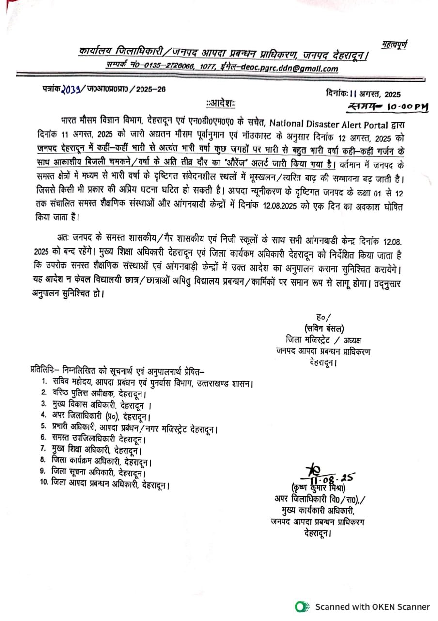 जनपद देहरादून के समस्त शासकीय / गैर शासकीय एवं निजी स्कूलों के साथ सभी आंगनबाडी केन्द्र 12 अगस्त 2025 को बन्द रहेंगे। डीएम सविन बंसल ने मुख्य शिक्षा अधिकारी देहरादून एवं जिला कार्यकम अधिकारी देहरादून को निर्देशित किया है कि समस्त शैक्षणिक संस्थाओं एवं आंगनबाड़ी केन्द्रों में उक्त आदेश का अनुपालन कराना सुनिश्चित करायेंगे।