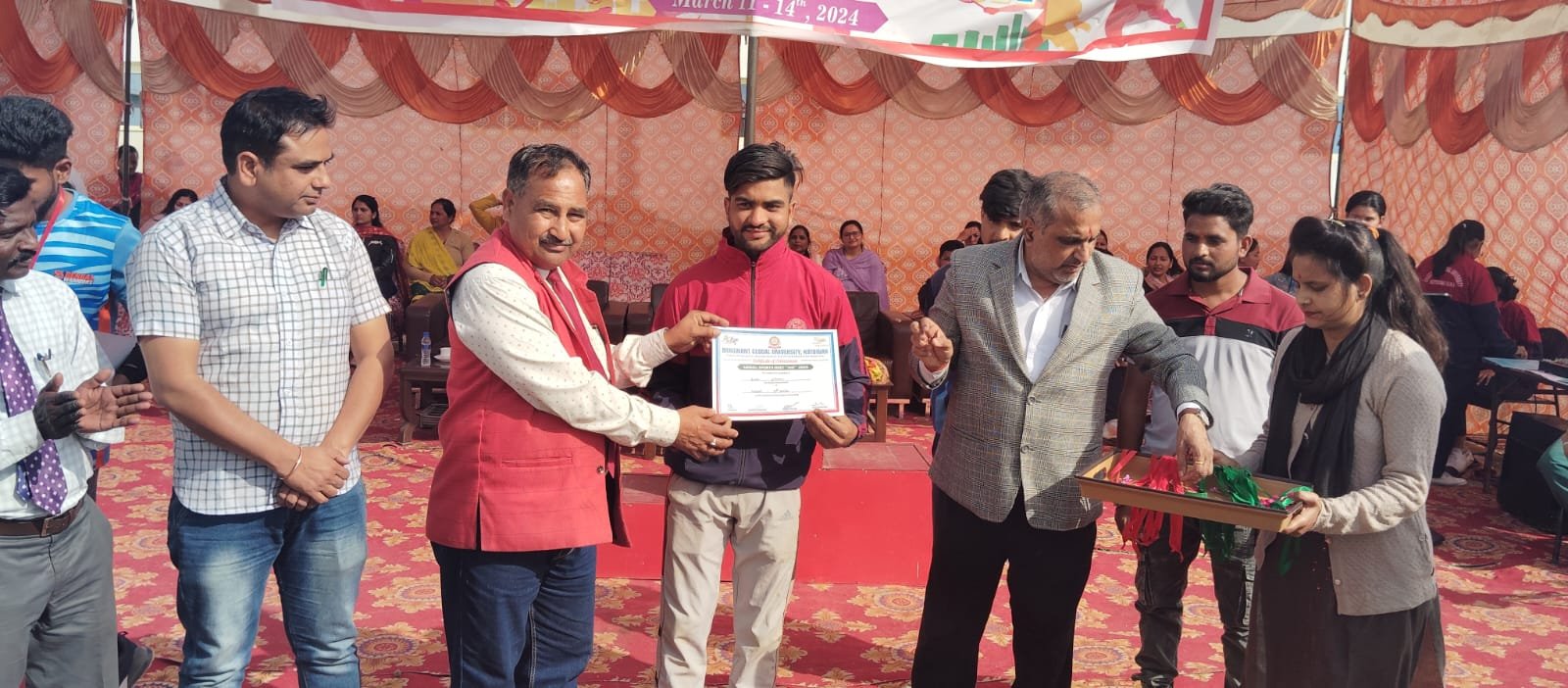 कार्यक्रम के अन्त में पुरस्कार वितरण समारोह का आयोजन किया गया जिसमें सभी प्रतिभागियों को मुख्य अतिथि व प्रति कुलपति के करकमलों द्वारा पुरस्कार व प्रमाण पत्र प्रदान किये गये। क्रीड़ा प्रभारी व प्रतियोगिता के समन्वयक मुकेश अधिकारी ने बताया कि प्रतियोगिता में 100 मी रेस, शतरंज, कैरम, बैडमिंटन, ऊंची कूद, भाला फेंक, वालीबाल, टेबल टेनिस आदि खेलों को सम्मिलित किया गया है। इस अवसर पर डॉ. सर्वानन, अरुण कुमार, गुरजंट, पिंकी, राहुल,ब्रिजेश, हर्षित, विकास, रवीन्द्र व सभी प्रतिभागी उपस्थित रहे।भगवंत ग्लोबल विश्वविद्यालय के कुलाधिपति डॉ. अनिल सिंह, उप कुलाधिपति डॉ. आशा सिंह व डॉ. विभांशु विक्रम सिंह ने वार्षिक खेलकूद प्रतियोगिता के शांति पूर्वक सम्पन्न होने पर प्रसन्नता व्यक्त की व विजेता प्रतिभागियों को बधाई व शुभकामनाएं प्रेषित की।