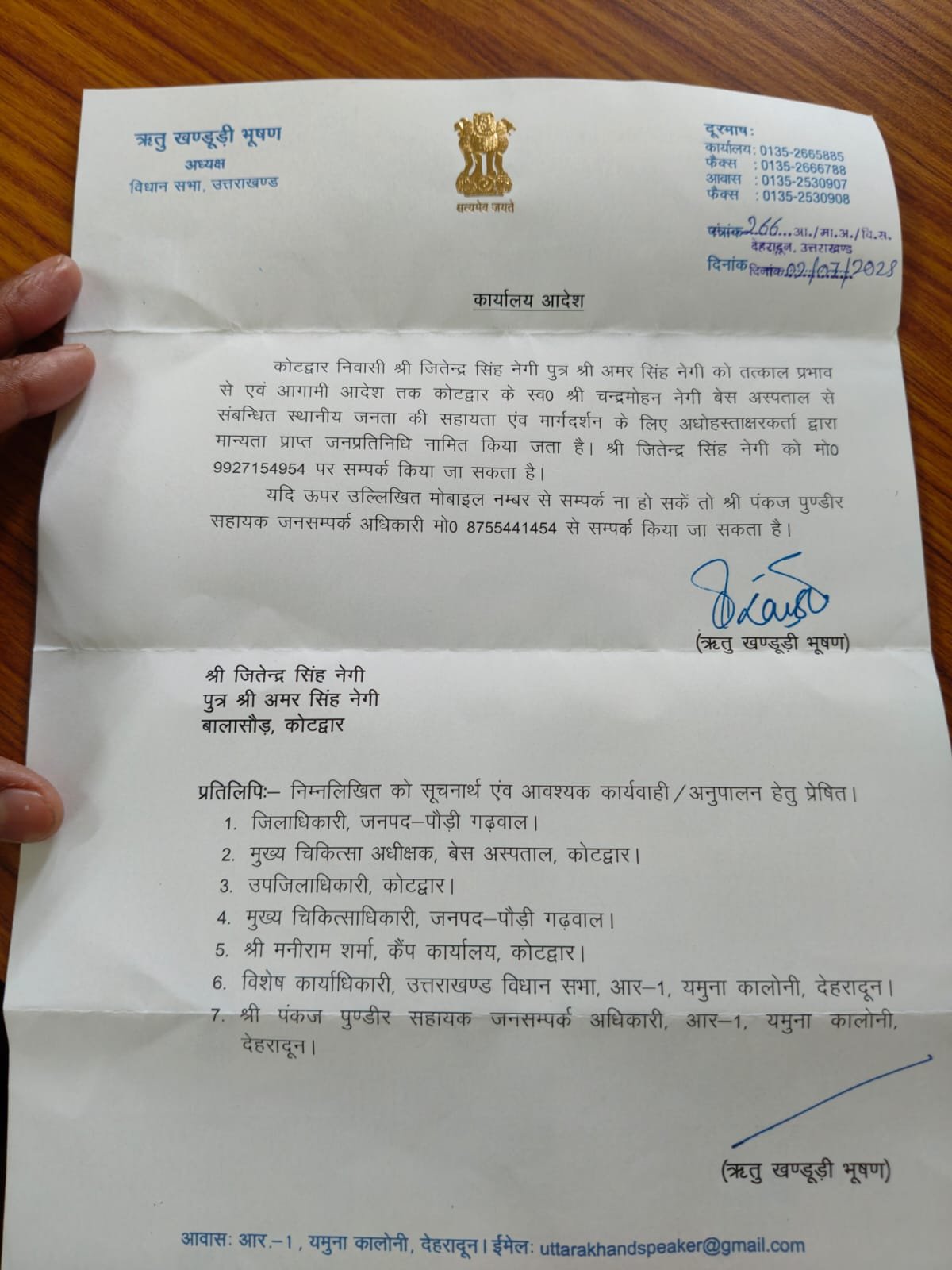 कोटद्वार : विधानसभा क्षेत्र में जनसंपर्क और जनसेवा को अधिक प्रभावी बनाने के उद्देश्य से उत्तराखंड विधानसभा की अध्यक्ष व विधायक कोटद्वार ऋतु खण्डूडी भूषण ने आज दो प्रतिनिधियों की नियुक्ति की। वार्ड संख्या 07, बेस चिकित्सालय क्षेत्र के लिए जितेन्द्र नेगी पुत्र अमर सिंह नेगी तथा वार्ड संख्या 27, नगर निगम के लिए कमल सिंह नेगी पुत्र स्वर्गीय हीरा सिंह नेगी को प्रतिनिधि नियुक्त किया गया है।