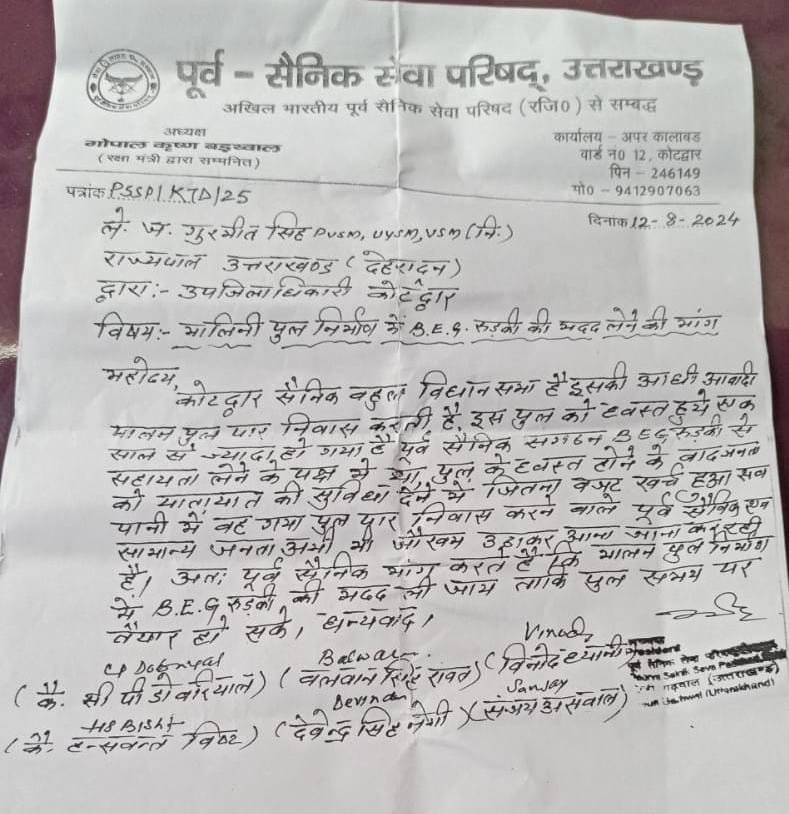 बीईजी रूड़की करें मालिनी पुल का निर्माण – पूर्व सैनिक सेवा परिषद