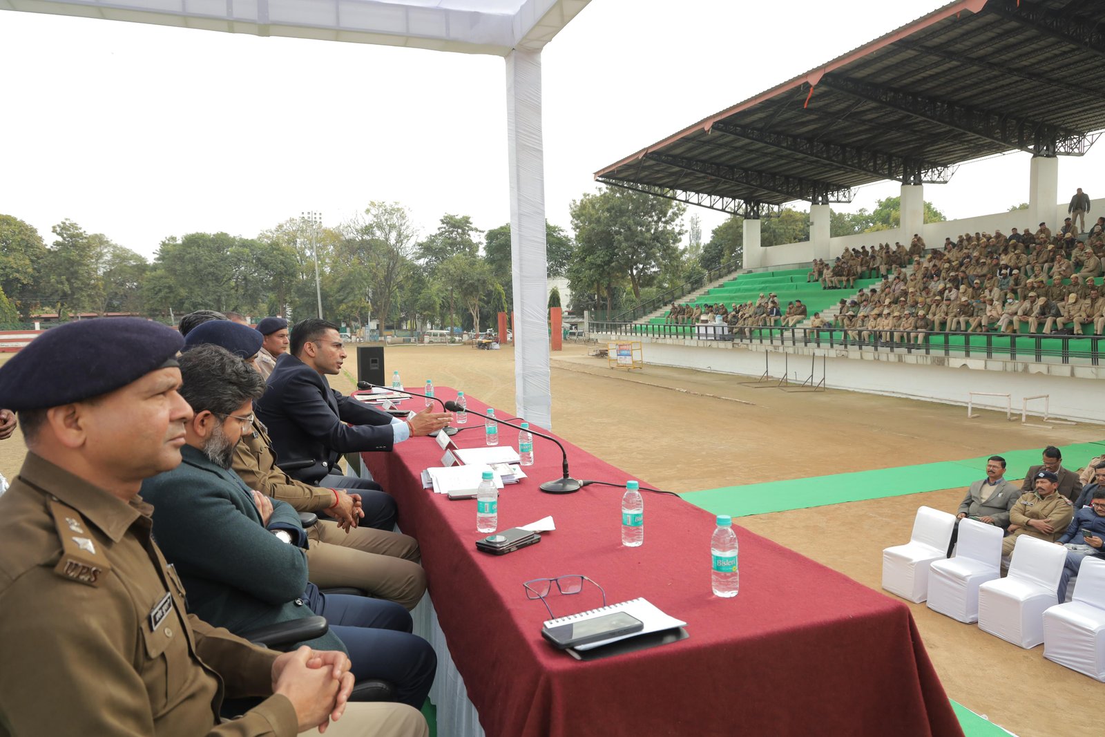 देहरादून : जिलाधिकारी/जिला निर्वाचन अधिकारी सविन बंसल एवं वरिष्ठ पुलिस अधीक्षक अजय सिहं एवं प्रेक्षक नागर निकाय निर्वाचन अहमद इकबाल अभिषेक रूहेला द्वारा नागर निकाय निर्वाचन में लगे जोनल/सैक्टर मजिस्टेªट, जोनल/सैक्टर पुलिस अधिकारियो एवं ड्यूटी में लगे पुलिस, होमगार्ड, पीआरडी जवानों की पुलिस लाईन रेसकोर्स में ब्रीफिंग की गई।