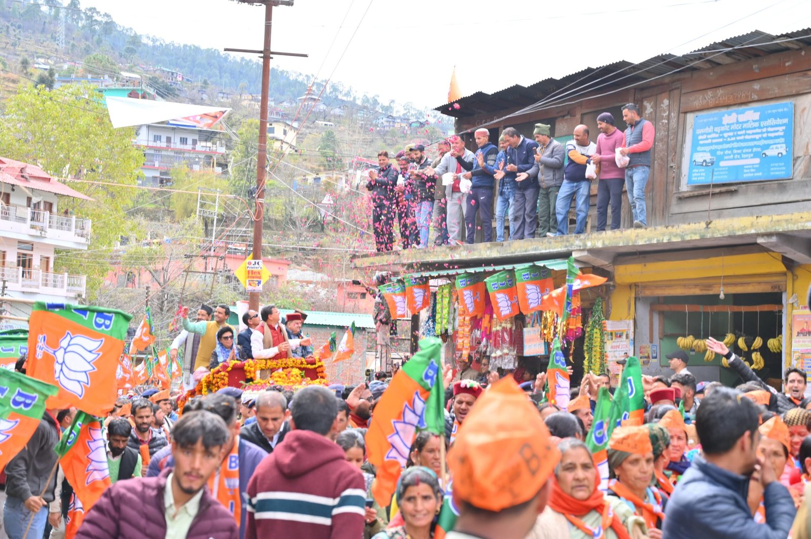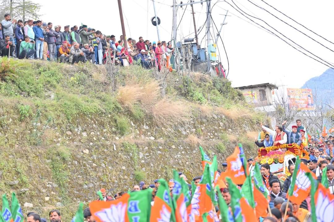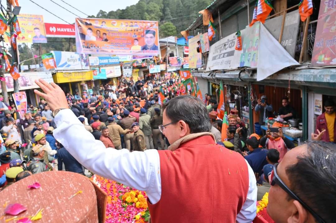 देहरादून : मुख्यमंत्री पुष्कर सिंह धामी ने मंगलवार को बड़कोट, उत्तरकाशी में मुख्य बाजार, बड़कोट से रामलीला मैदान तक आयोजित रोड शो में प्रतिभाग किया। इस दौरान हजारों की संख्या में मौजूद महिलाओं, क्षेत्रीय जनता ने मुख्यमंत्री का पुष्प वर्षा कर स्वागत किया। रंवाई क्षेत्र की जनता के भव्य स्वागत से मुख्यमंत्री अभिभूत नज़र आए। मुख्यमंत्री ने भी लोगों पर पुष्प वर्षा कर उनका अभिनंदन किया। इस अवसर पर भाजपा प्रदेश अध्यक्ष महेंद्र भट्ट, सांसद माला राज्य लक्ष्मी शाह, भाजपा जिला अध्यक्ष सतेंद्र राणा, विधायक दुर्गेश्वर लाल, विधायक सुरेश चौहान, विधायक संजय डोभाल, मीडिया प्रभारी भाजपा मनवीर चौहान एवं अन्य लोग मौजूद रहे।