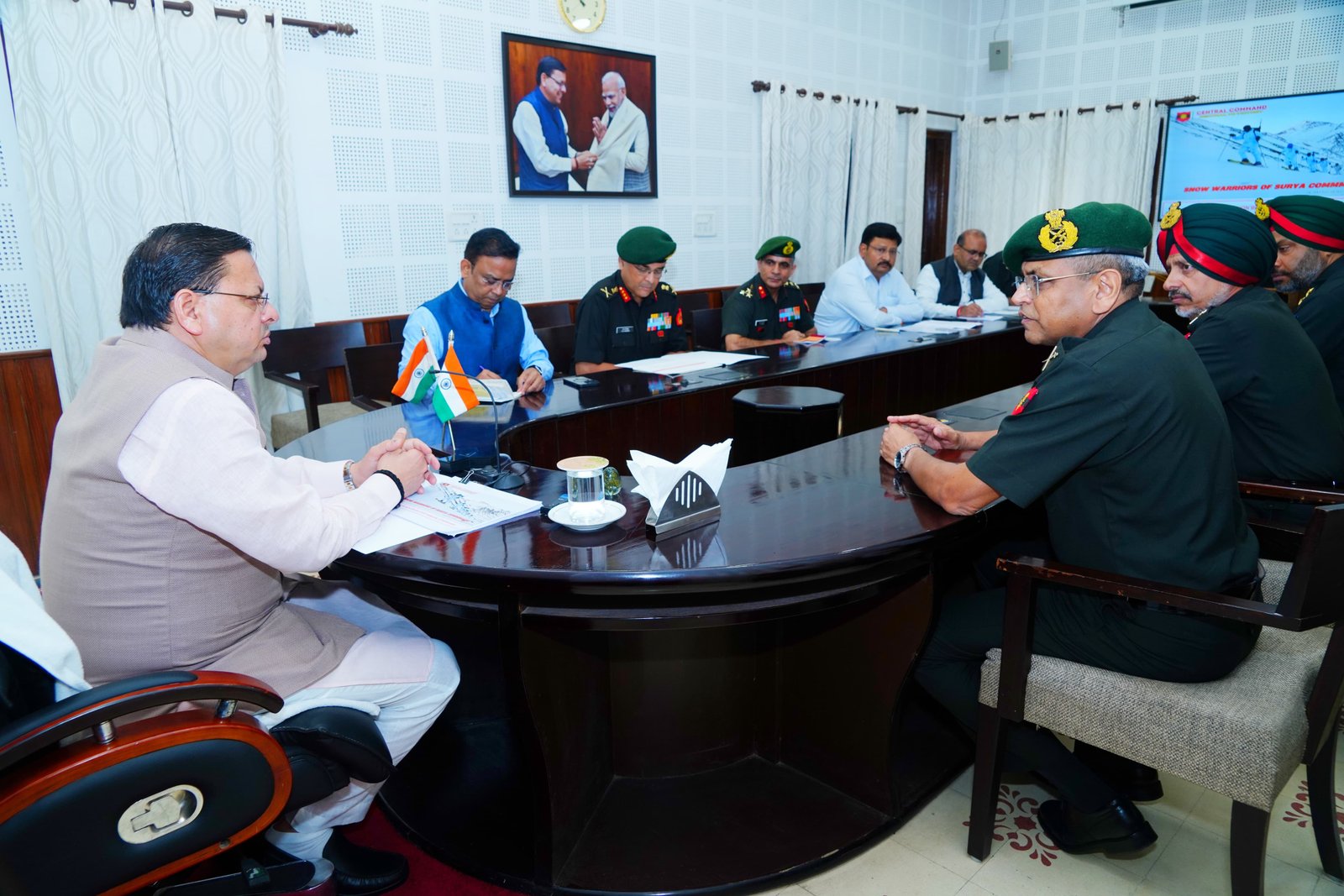 लेफ्टिनेंट जनरल अनिंद्य सेनगुप्ता ने मुख्यमंत्री को सीमांत क्षेत्रों के समग्र विकास हेतु मध्य कमान द्वारा संचालित कार्यक्रमों की जानकारी दी। उन्होंने बताया कि भारतीय सेना, सुरक्षा व्यवस्था के साथ-साथ सामाजिक विकास हेतु भी पूरी प्रतिबद्धता के साथ कार्य कर रही है। उन्होंने बताया कि सीमांत क्षेत्रों में बुनियादी ढांचे के विकास, सामुदायिक सहभागिता, युवाओं के साथ संवाद और अग्रिम क्षेत्रों में पर्यटन को बढ़ावा देने के लिए कई महत्वपूर्ण पहल की गई हैं। इस अवसर पर प्रमुख सचिव आर.के. सुधांशु, सचिव दीपेंद्र चौधरी, विनोद कुमार सुमन और अन्य सैन्य अधिकारी भी उपस्थित रहे।