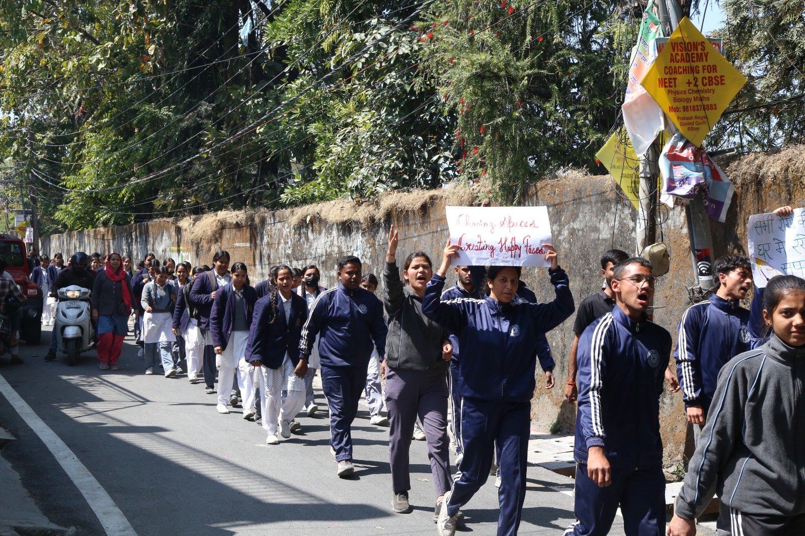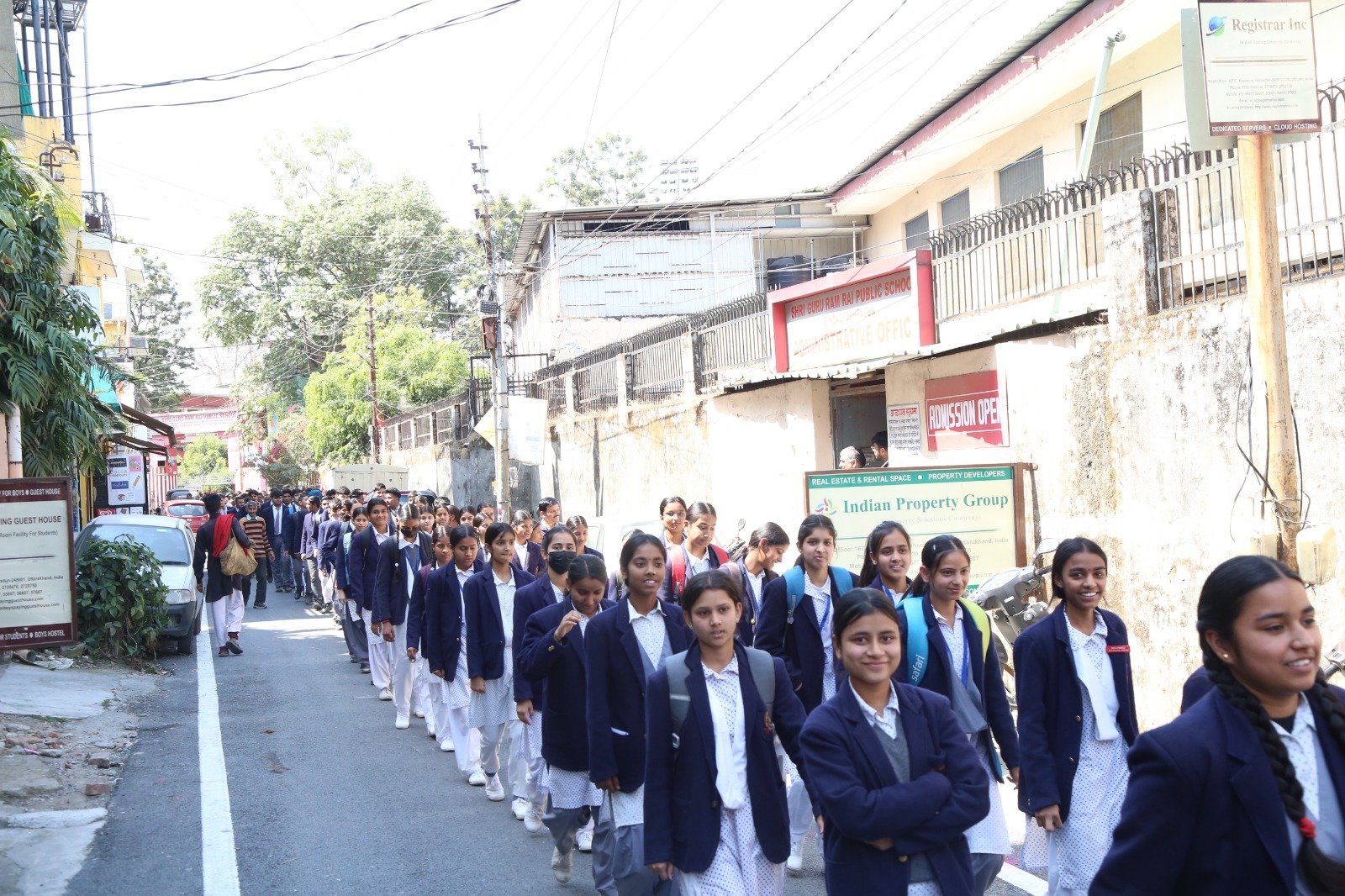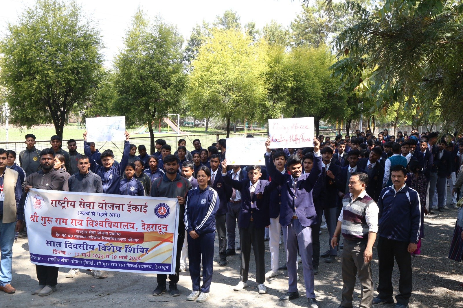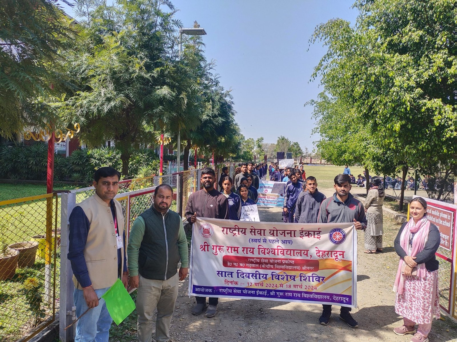 देहरादून : श्री गुरु राम राय विश्वविद्यालय की राष्ट्रीय सेवा योजना इकाई द्वारा तिलक नगर क्षेत्र में चल रहे सात दिवसीय विशेष शिविर  के  पांचवें दिन  सुबह  स्वयंसेवियो द्वारा स्वच्छता रैली का आयोजन किया गया जिसमें श्री गुरु राम राय बिंदल स्कूल के छात्रों ने भी प्रतिभाग किया। स्वयंसेवियो द्वारा स्वच्छता के नारों के साथ बिंदल क्षेत्र में जागरूकता फैलाने का प्रयास किया गया।  इससे पूर्व आज प्रातः काल में स्वयंसेवियों द्वारा प्रभात फेरी भी  निकाली  गई।  रैली को सफल बनाने में गरिमा शर्मा प्रधानाचार्य, डॉ. दीपक सोम कार्यक्रम अधिकारी, एके जायसवाल, डॉक्टर मनवीर नेगी, आशु डिमरी इत्यादि का महत्वपूर्ण सहयोग रहा। शिविर के पांचवें दिन की शुरुआत लक्ष्य गीत,  योग अभ्यास तथा परेड के साथ की गई ।