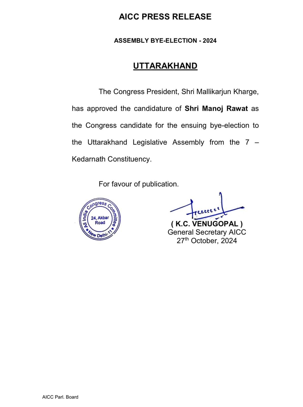 कांग्रेस ने केदारनाथ उप चुनाव में मनोज रावत को किया प्रत्‍याशी घोषित