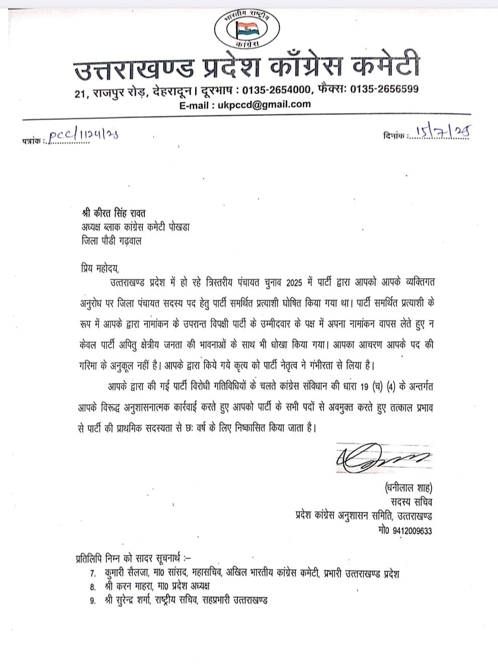 देहरादून : उत्तराखंड कांग्रेस कमेटी की ओर से लम्बे समय से पार्टी विरोधी गतिविधियों में संलिप्त तीन पार्टी नेताओं को तत्काल प्रभाव से कांग्रेस पार्टी की प्राथमिक सदस्यता से 6 साल के लिए निष्कासित किया गया है। पोखडा ब्लाक कांग्रेस कमेटी के अध्यक्ष कीरत सिंह रावत की ओर से पार्टी समर्थित उम्मीदवार होने के बावजूद विपक्षी उम्मीदवार के के समर्थन में अपना नामांकन वापस लेकर न केवल कांग्रेस पार्टी बल्कि स्थानीय जनता और कांग्रेसजनों की भावनाओं के साथ भी खिलवाड कर धोखा दिया गया है। इसी प्रकार पूर्व ब्लाक अध्यक्ष खिर्सू चतर सिंह रावत की ओर से पार्टी के समर्थित उम्मीदवार के खिलाफ चुनाव में प्रतिभाग किया जा रहा है। जिसे कांग्रेस नेतृत्व ने गम्भीरता से लिया है।