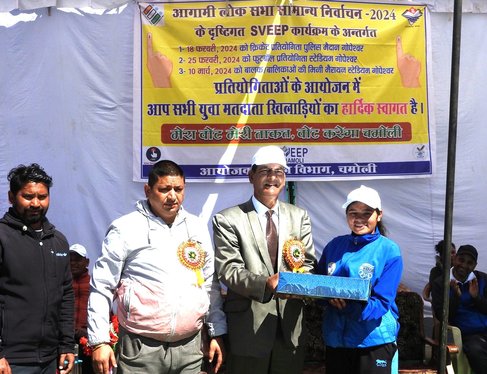 जिला सैनिक कल्याण अधिकारी कर्नल सुबोध शुक्ला ने विजेता खिलाड़ियों कोे पुरस्कार वितरित किए। इसके अतिरिक्त मुख्य अतिथि ने प्रतिभागी खिलाडियों, अधिकारी, कर्मचारियों, प्रतियोगिता के निर्णायकों को मतदाता शपथ दिलाई। मैराथन के निर्णायक की भूमिका में केसी पंत, गोपाल सिंह बिष्ट, जयदीप झिंक्वाण, पृथ्वी रावत, रमेश पंखोली, नवीन कुंवर, रश्मि विष्ट, बबीता रावत, हेमा नयाल, संगीता नेगी थे। इस अवसर पर मनोज भण्डारी, क्रीडा अधिकारी जयवीर सिंह रावत सहित खेल विभाग के सीएओ बीएस चौधरी, एनएस नेगी, राजपाल सिंह, उत्तम सिंह, लखपत सिंह, स्वीप कार्यक्रम से सुबोध डिमरी, विक्रम सिंह कठैत, यूथ क्लब गोपेश्वर के भीम सिंह व विवेक सोनी एवं विभिन्न संस्थाओं के टीम प्रभारी मौजूद थे तथा पुरस्कार वितरण समारोह का संचालन श्री पृथ्वी सिंह रावत द्वारा किया गया।