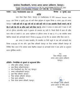 देहरादून।  भारत मौसम विज्ञान विभाग, देहरादून एवं एन०डी०एम०ए० के सचेत National Disaster Alert Portal द्वारा दिनांक 31 जुलाई, 2024 को जारी मौसम पूर्वानुमान के अनुसार दिनांक 01 अगस्त, 2024 को जनपद देहरादून में कहीं-कहीं भारी से बहुत भारी वर्षा एवं कहीं-कहीं गर्जन के साथ आकाशीय बिजली चमकने / वर्षा के तीव्र से अति तीव्र दौर का ऑरेंज अलर्ट जारी किया गया है। वर्तमान में जनपद के समस्त क्षेत्रों में मध्यम से भारी वर्षा को दृष्टिगत सवेदनशील स्थलों में भूस्खलन की सम्भावना बढ़ जाती है। जिससे किसी भी प्रकार की अप्रिय घटना घटित हो सकती है। अतः आपदा न्यूनीकरण के दृष्टिगत जनपद के कक्षा 01 से 12 तक संचालित समस्त शैक्षणिक संस्थाओं और आंगनबाडी केन्द्रों में दिनांक 01.08.2024 को एक दिन का अवकाश घोषित किया जाता है। अतः जनपद के समस्त शासकीय / गैर शासकीय एवं निजी स्कूलों के साथ सभी आंगनबाडी केन्द्र दिनांक 01.08.2024 को बन्द रहेंगे। मुख्य शिक्षा अधिकारी देहरादून एवं जिला कार्यक्रम अधिकारी देहरादून को निर्देशित किया जाता है कि उपरोक्त समस्त शैक्षणिक संस्थाओं एवं आंगनबाड़ी केन्द्रों में उक्त आदेश का अनुपालन कराना सुनिश्चित करायेंगे ।