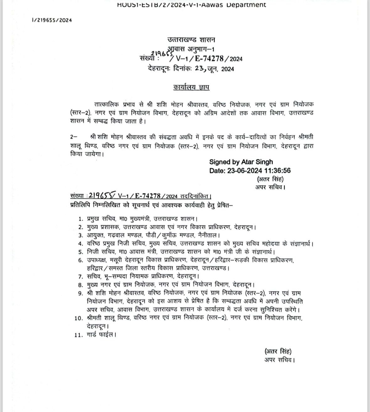 भ्रष्टाचार संबंधी शिकायत प्राप्त होने, काम को रोकने संबंधी आरोपों पर धामी सरकार का सख्त फैसला, टाउन प्लानिंग के एचओडी शशि मोहन श्रीवास्तव पर कड़ा एक्शन, शासन से किया अटैच