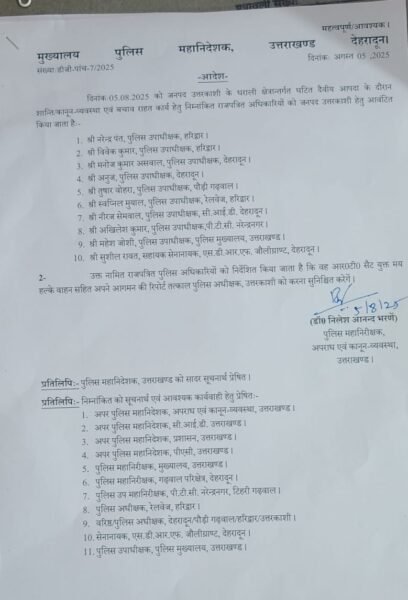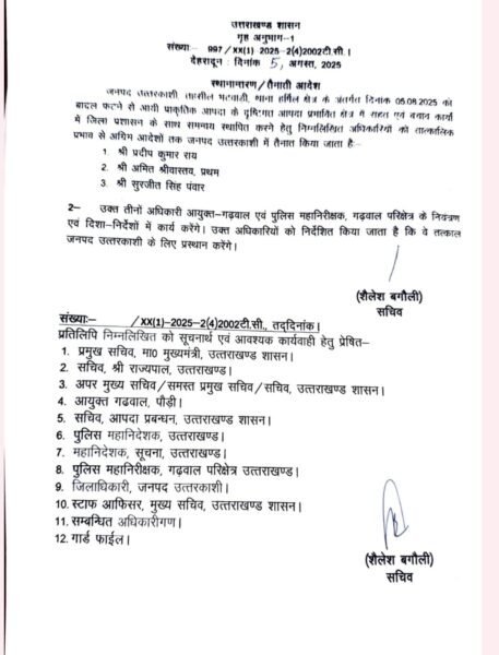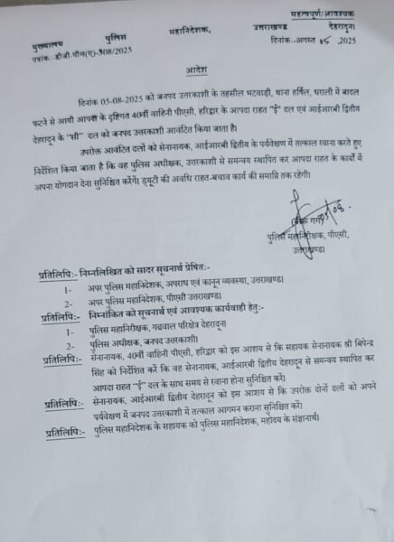 देहरादून/उत्तरकाशी :  उत्तरकाशी जनपद के धराली क्षेत्र में बादल फटने और भीषण बाढ़ के बाद राज्य सरकार और पुलिस मुख्यालय ने बड़े पैमाने पर राहत एवं बचाव कार्य शुरू कर दिए हैं। आपदा की गंभीरता को देखते हुए उच्चस्तरीय प्रशासनिक और पुलिस अधिकारियों की तत्काल तैनाती के आदेश जारी किए गए हैं।