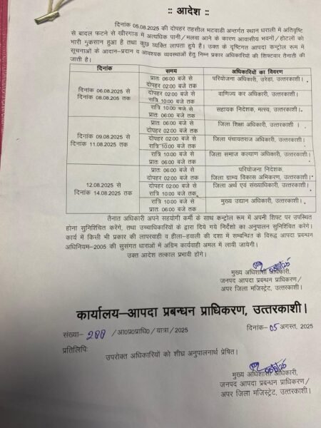 आपदा प्रबंधन प्राधिकरण, उत्तरकाशी ने 6 से 14 अगस्त तक राहत कैंपों और कंट्रोल रूम संचालन के लिए अधिकारियों की शिफ्टवार ड्यूटी लगाई है। इसके अलावा जेसीबी, पोकलैंड और लोडर मशीनें प्रभावित क्षेत्र में भेजने के आदेश दिए गए हैं।