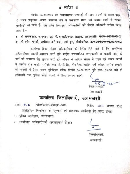 6 अगस्त को सुबह 5 बजे से दो नोडल अधिकारियों—राजकिशोर (कमांडर, बीओआरटीईओपीएन, तहला) और हरीश पंत (अधिशासी अभियंता, लोक निर्माण विभाग) को मौके पर तैनात किया जाएगा।