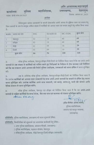 देहरादून, हरिद्वार, पौड़ी और टिहरी से कुल 160 पुलिस कर्मियों (6 इंस्पेक्टर, 54 SI/ASI और 100 हेड कांस्टेबल/कॉन्स्टेबल) को आवश्यक उपकरणों के साथ मौके पर भेजा गया है। सभी को 24×7 राहत और बचाव में जुटने के निर्देश दिए गए हैं।