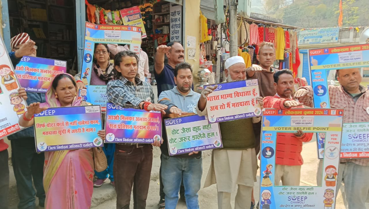 दूसरी ओर स्वीप की ओर से देवखाल, सोनला बछेर, जोशीमठ नगर क्षेत्र में बूथ सप्ताह आयोजित किया गया। साथ ही मतदाता जागरुकता रथ के माध्यम से हाट कल्याणी, उलंगरा, ताजपुर, बामनबेरा, कंडाई, बकरीगाड, ल्वांणी, मुंदोली, लोहजंग, कुलिंग, दिदना, पूर्णा, नंदकेसरी, चेपडों, राडीबगड़, सूना, थराली बाजार, भेंटा और वांण में जागरुकता अभियान चलाया गया। इस मौके पर विक्रम सिंह, रश्मी बिष्ट, संतोशी नेगी, हेमा नयाल, देवेंद्र सिंह, संजीव बुटोला, राजपाल सिंह, उत्तम, लखपत, विक्रम कोठारी, राजेन्द्र प्रसाद सती, प्रबोध डिमरी, पृथ्वी रावत, दीवान सिंह नेगी और शिवराज बोरा आदि मौजूद थे।