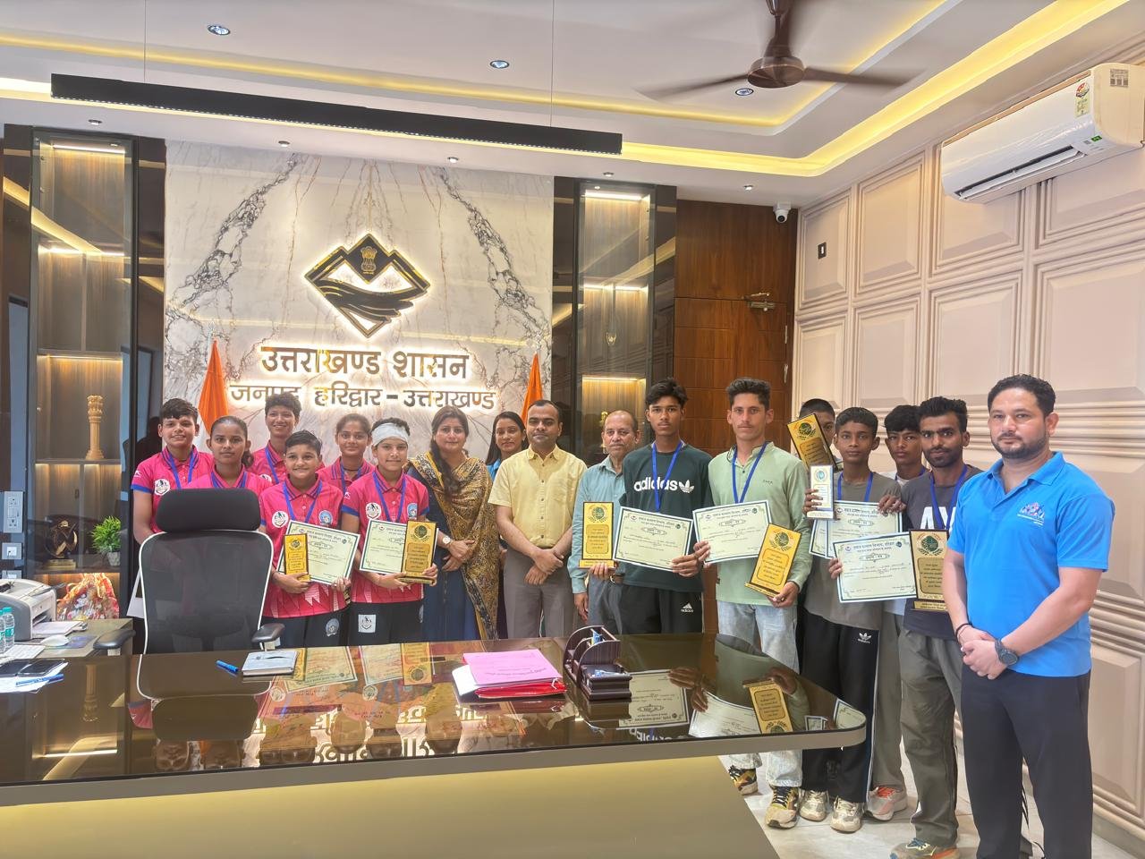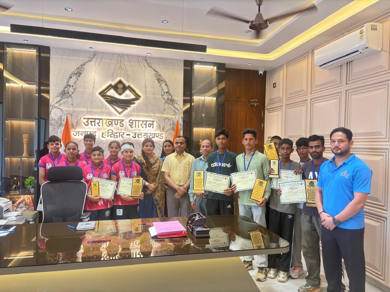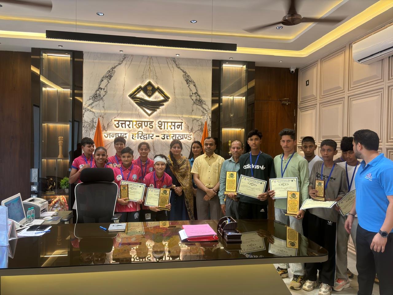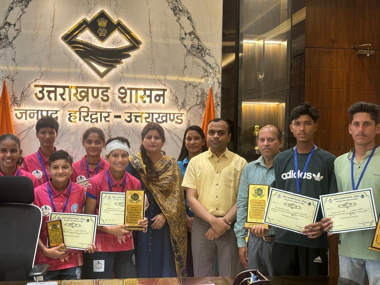 जिला प्रशासन एवं समाज कल्याण विभाग के तत्वाधान में नशा मुक्त भारत अभियान के सफल क्रियान्विन हेतु 12 जून को रन अगेंस्ट ड्रग्स दौड का आयोजन विकास भवन रोशनाबाद हरिद्वार से स्पोर्टस स्टेडियम रोशनाबाद हरिद्वार तक किया गया। इस दौड़ में अंडर 14 बालक एवं बालिका वर्ग तथा ओपन आयु वर्ग के अन्तर्गत समस्त आयु वर्ग के प्रतिभागियों द्वारा प्रतिभाग किया गया। उक्त दौड़ में हर वर्ग से प्रथम तीन पायदान प्राप्त करने वाले प्रतिभागियों को आज जिला कार्यालय में जिलाधिकारी मयूर दीक्षित द्वारा प्रथम, द्वितीय एवं तृतीय स्थान प्राप्त करने वाले छात्र छात्राओं को मेडल, ट्राफी एवं प्रमाण पत्र प्रदान देकर सम्मानित किया गया।
