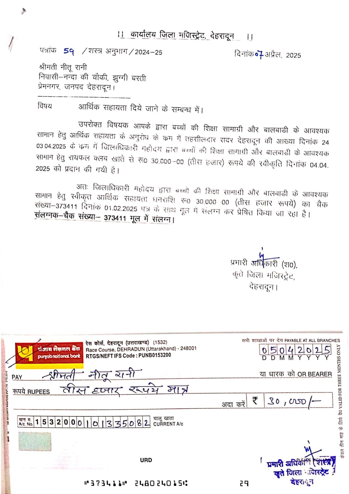 आर्थिक सहायता को भटक रही, एकल महिला को 3 हजार, अनाथ बहन-भाई अदिति व आदित्य जिनके माता-पिता दोनों की मृत्यु हो गई है तथा अपने छोटे भाई के साथ रहती हैं, उनके पिता अदिति के नाम से एचडीएफसी फाइनेंस से ऋण लिया था, पिता की मृत्यु उपरान्त वे शेष किस्त जमा करने में असमर्थ थी, फाईनेंस रिकवरी वाले आए दिन उनको किस्त जमा करने के लिए परेशान कर रहे थे, जन दिवस कार्यक्रम में प्रकरण संज्ञान में आते ही जिलाधिकारी ने उनका ऋण को रायफल फंड से भुगतान के निर्देश दिए, जिसके क्रम में आज अदिति को 50 हजार धनराशि चैक रायफल फंड से दिया गया है।