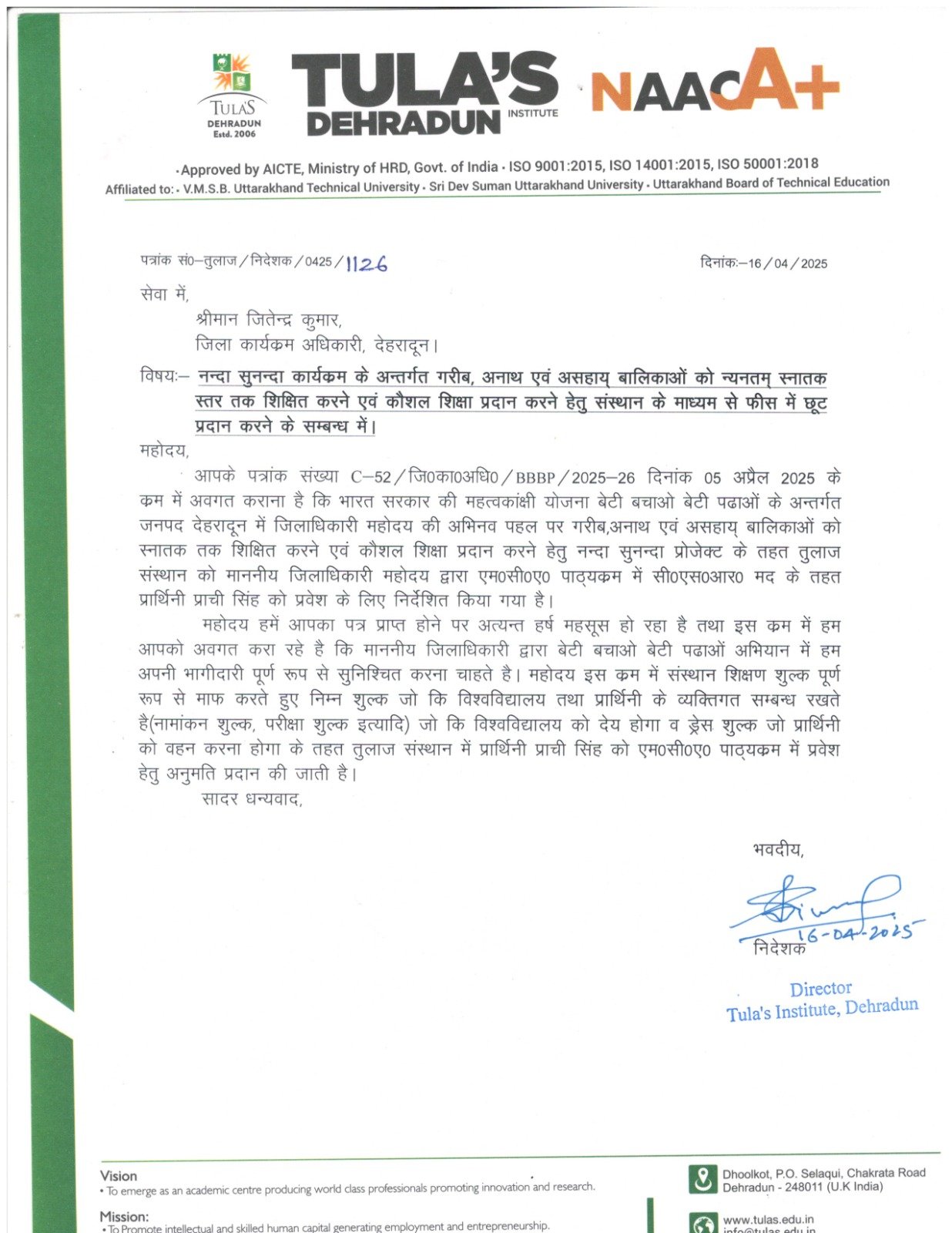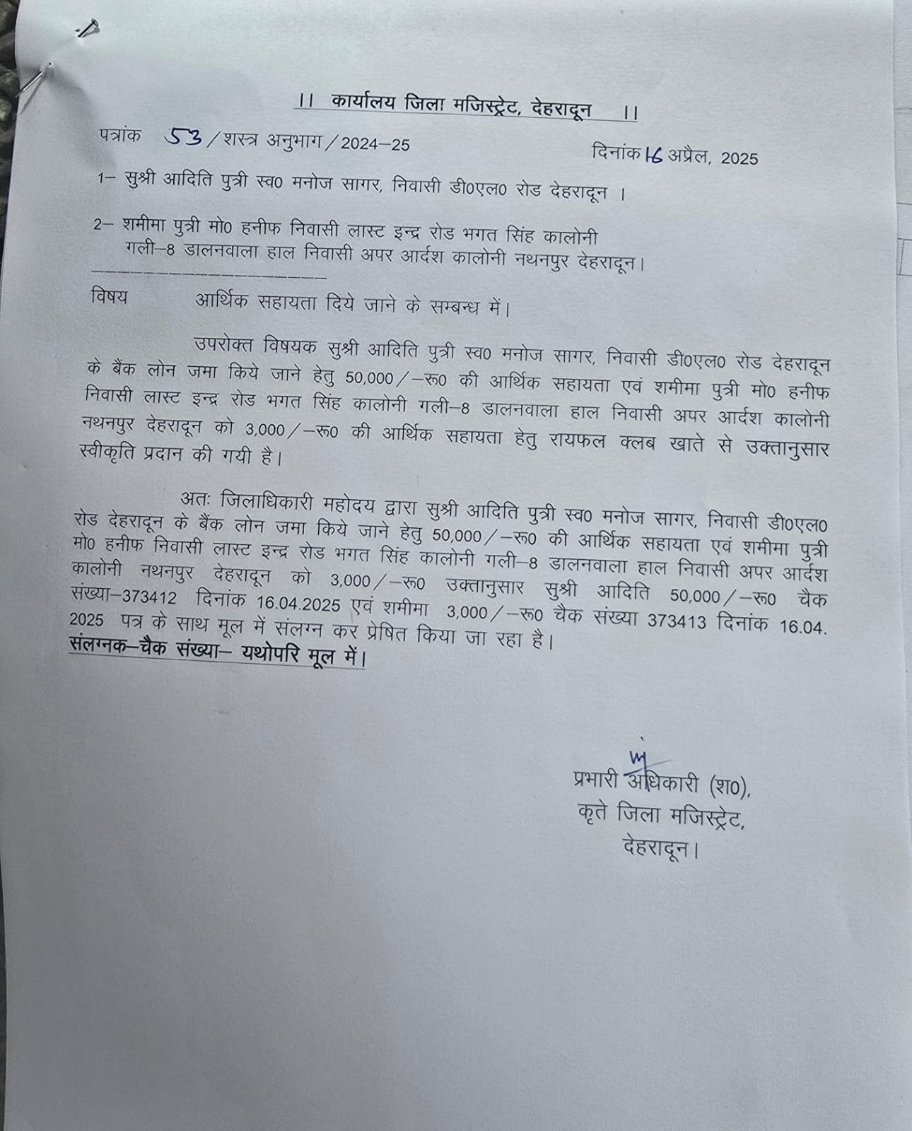 देहरादून : जिलाधिकारी सविन बंसल बच्चों, बुजुर्ग, महिला, निर्बल, असहाय, एवं दिव्यांग था आमजन के हितों के प्रति संवेदनशील हैं, इसका परिणाम है कि आए दिन उनके कार्यालय में फरियादियों की कतार रहती है। जन समस्याओं का निरंतर समाधान का गंभीर प्रयास। सीएम की प्रेरणा से डीएम सविन बसंल ने आज कलेक्ट्रेट परिसर में दिव्यांग शिक्षित महिला गुरिंदर को नियुक्ति पत्र, असहाय जरूरतमंद अनाथ बहन-भाई अदिति-आदित्य का 50 हजार डीएम आफिस जमा कराया, एकल विधवा महिला शमीमा को 3 हजार का आर्थिक सहायता चैक दिया गया।