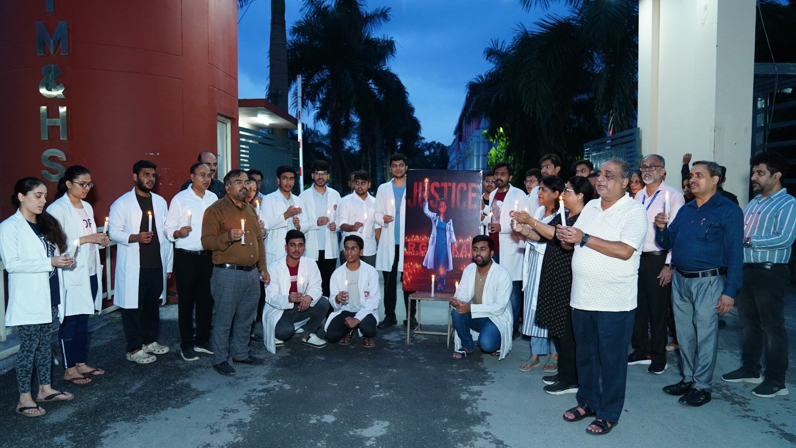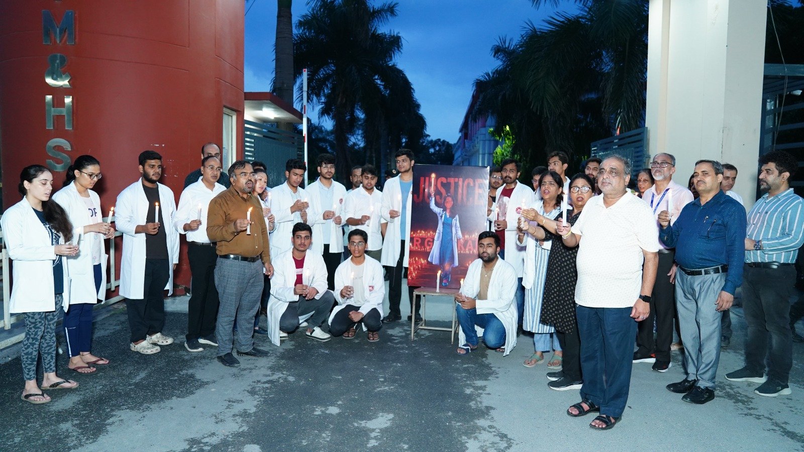 देहरादून। कोलकाता में महिला डाॅक्टर के साथ हुए दुष्कर्म और जघन्य हत्या के विरोध में श्री महंत इन्दिरेश अस्पताल के डाॅक्टरों ने विरोध जताया। उन्होंने शनिवार को विरोध स्वरूप काली पट्टी बांधकर प्रदर्शन किया। प्रदर्शन में शामिल डाॅक्टरों ने एक सुर में कहा कि कोलकाता में हुआ घटनाक्रम एक हृदयविदारक घटना है। विरोध प्रर्दशन में शामिल डाॅक्टरों ने दोषियों के विरूद्ध कड़ी से कड़ी कानूनी कार्रवाई की मांग की। देर शाम डाॅक्टरों ने कैंडिल मार्च निकालकर दिवंगत आत्मा के प्रति गहरी संवेदनाएं व्यक्त कीं।