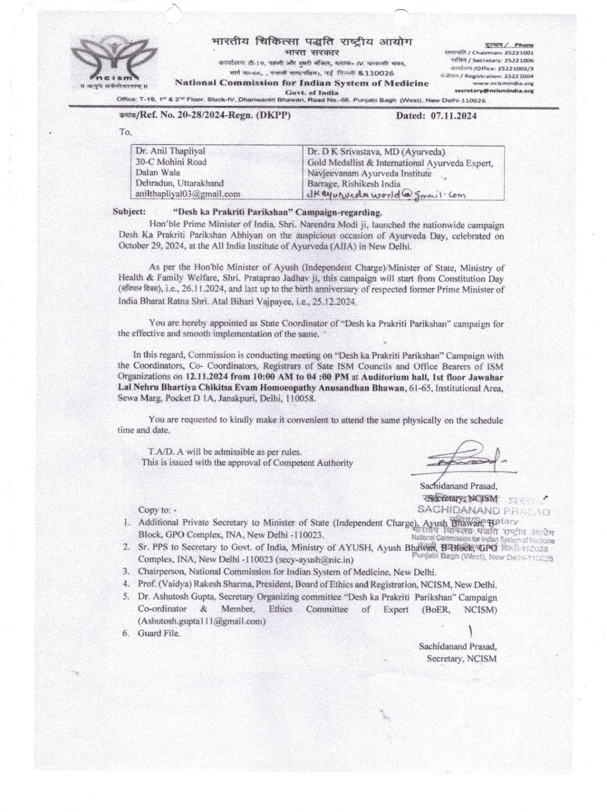 देहरादून। देश की पारंपरिक चिकित्सा को विश्व पटल पर नई पहचान दिलाने के लिए मुहिम गतिमान है। प्रधानमंत्री नरेन्द्र मोदी द्वारा देश की प्रकृति परीक्षण अभियान कैंपेन को देश भर में प्रचारित प्रसारित किया जा रहा है। इस क्रम में देश के विभिन्न राज्यों में देश का प्राकृतिक परीक्षण अभियान के तहत कोर्डिनेटरों की नियुक्ति की गई है। उत्तराखण्ड से डाॅ अनिल थपलियाल को इस मुहिम का राज्य समन्वयक बनाया गया है। भारतीय चिकित्सा पद्धति राष्ट्रीय आयोग (भारत सरकार) के द्वारा डाॅ अनिल थपलियाल को प्राकृतिक परीक्षण अभियान का स्टेट कोओर्डिनेटर चुना गया है। श्री गुरु राम राय विश्वविद्यालय के प्रेसीडेंट श्रीमहंत देवन्द्र दास जी महाराज, विश्वविद्यालय के कुलपति, प्रति-कुलपति, कुलसचिव एवं स्कूल ऑफ योगिक साइंस एण्ड नैचुरोपैथी के डीन डाॅ कंचन जोशी ने डाॅ अनिल थपलियाल को बधाई दी।