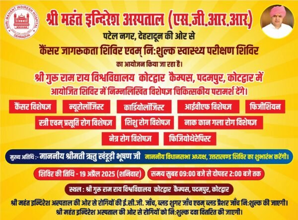 कोटद्वार । श्री गुरु राम राय कॉलेज ऑफ नर्सिंग एंड पैरा मेडिकल कॉलेज कोटद्वार द्वारा श्री महंत इन्दिरेश अस्पताल देहरादून की ओर से एसजीआरआर स्कूल पदमपुर कोटद्वार में शनिवार को निःशुल्क स्वास्थ्य जांच शिविर लगाया जायेगा। कॉलेज के प्राचार्य डॉ गिरीश उनियाल ने बताया कि सुबह 9 बजे शुरू होने वाले शिविर में कैंसर, हृदय रोग, न्यूरोलॉजिस्ट, शिशु रोग, फिजीशियन, नेत्र रोग, स्त्री एवं प्रसूति रोग, आईवीएफ, फिजियो थेरेपिस्ट विशेषज्ञ चिकित्सक चिकित्सीय परामर्श देंगे। साथ ही मरीजों की जांच कर निःशुल्क दवाईयां दी जाएगी। शिविर में विधानसभा अध्यक्ष रितु खण्डूडी भूषण, लैंसडौन विधायक दलीप रावत, महापौर शैलेन्द्र सिंह रावत भी मौजूद रहेंगे। प्राचार्य ने क्षेत्र की जनता से अधिक से अधिक संख्या में पहुंचकर शिविर का लाभ उठाने की अपील की है।