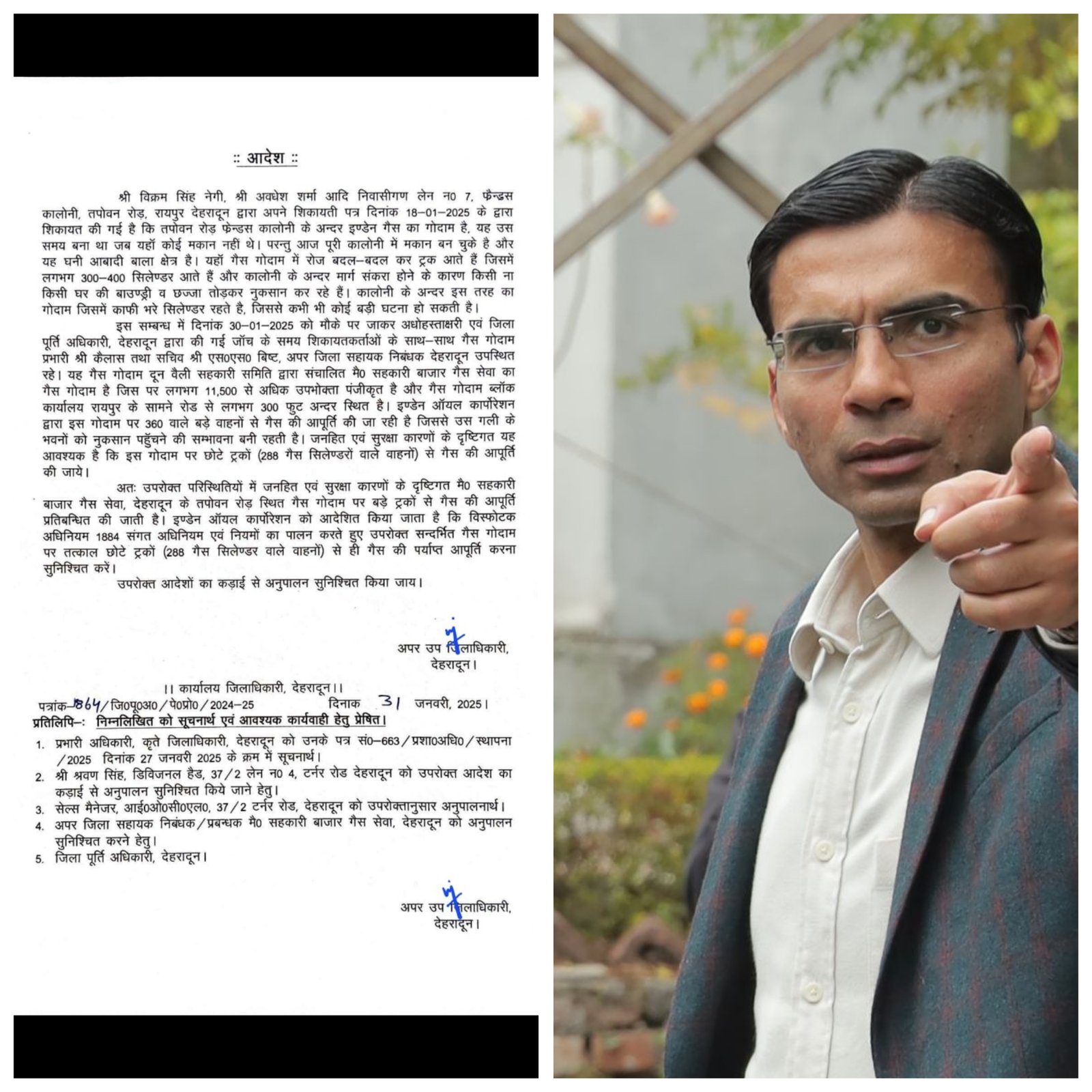 जनता दर्शन/जनसुनवाई कार्यक्रम में 18-01-2025 को जिलाधिकारी सविन बंसल को दिए अपने शिकायती पत्र में शिकायत की गई है कि तपोवन रोड़ फेन्डस कालोनी के अन्दर इण्डेन गैस का गोदाम है, यह उस समय बना था जब यहाँ कोई मकान नहीं थे। परन्तु आज पूरी कालोनी में मकान बन चुके है और यह घनी आबादी बाला क्षेत्र है। यहाँ गैस गोदाम में रोज बदल-बदल कर ट्रक आते हैं जिसमें लगभग 300-400 सिलेण्डर आते हैं और कालोनी के अन्दर मार्ग संकरा होने के कारण किसी ना किसी घर की बाउण्ड्री व छज्जा तोड़कर नुकसान कर रहे हैं। कालोनी के अन्दर इस तरह का गोदाम जिसमें काफी भरे सिलेण्डर रहते है, जिससे कभी भी कोई बड़ी घटना हो सकती है।