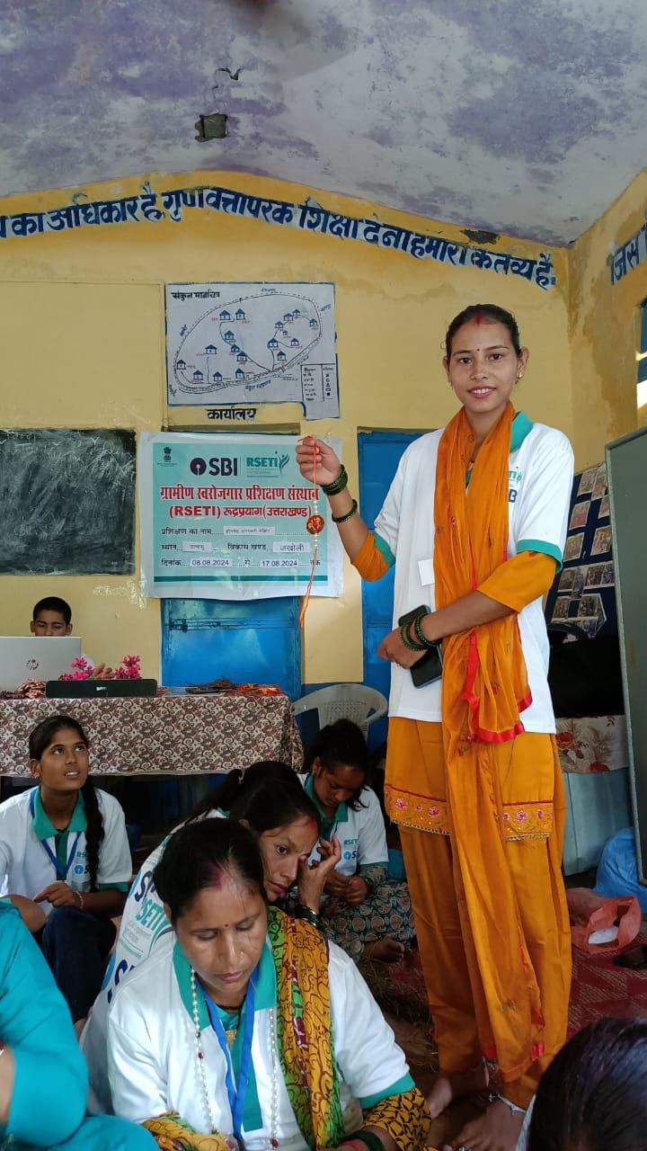आरसेटी के निदेशक किशन सिंह रावत द्वारा बेरोजगार युवक एवं युवतियों को आरसेटी द्वारा निशुल्क प्रशिक्षण एवं स्वरोगार के अवसर प्रदान किये जा रहे है और प्रशिक्षण लेने वाली प्रशिक्षु को अपना रोजगार स्थापित करने का यह सुनहरा मंच है। जिससे सभी अपना और अपने परिवार की आर्थिक स्थिति को बेहतर बना सकते है साथ ही प्रशिक्षणार्थियों को डिजिटल मार्केटिंग, लेखांकन व बैकिंग से संबंधी विभिन्न जानकारी दी गई। प्रशिक्षण के दौरान पिरुल की राखियां, गोबर के दीये, गोबर की धूप, हवन सामग्री की बाजार में मांग के बारे में समझाया गया। साथ ही उन्हें बताया गया कि प्रशिक्षण प्राप्त कर महिलाएं अपना लघु उद्यम स्थापित कर अपना भविष्य संवार सकती हैं।