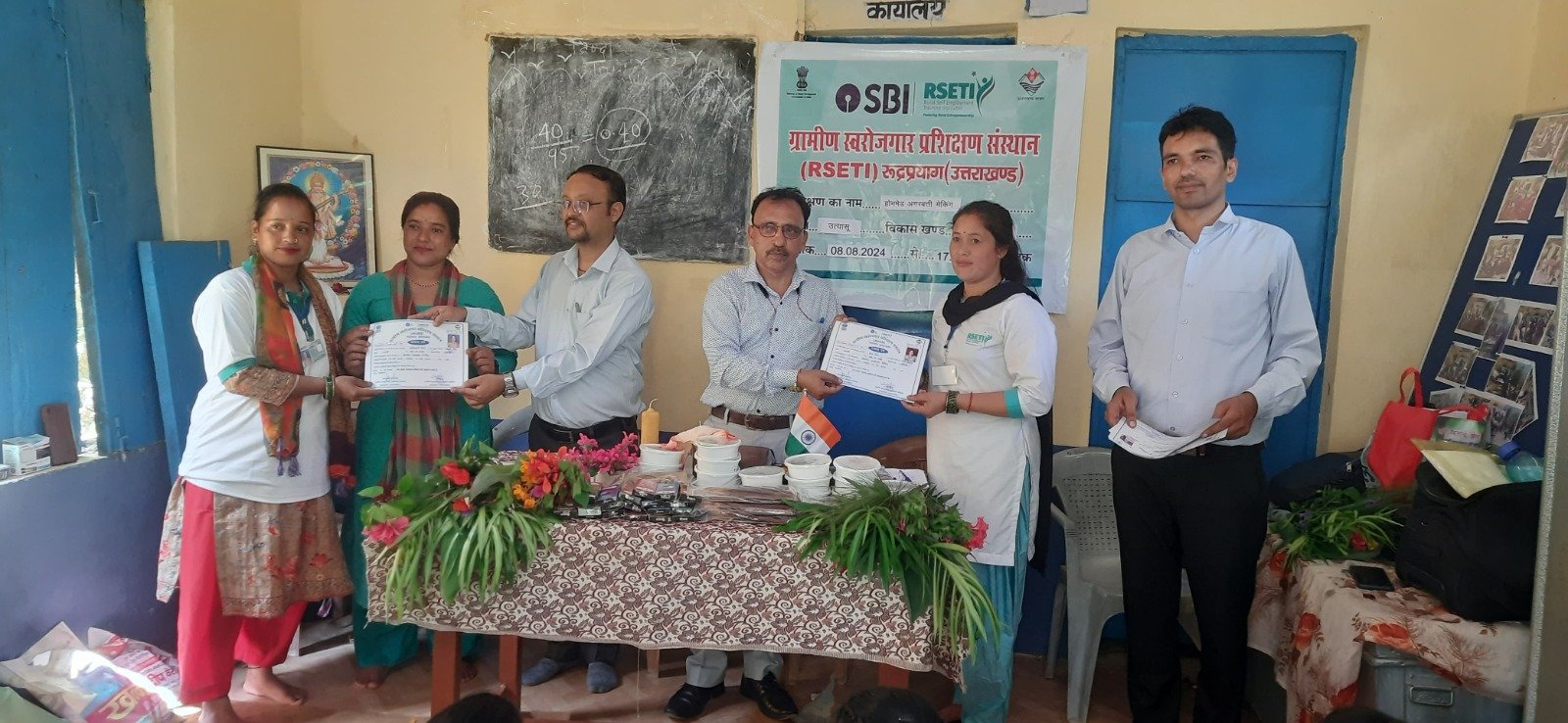 आरसेटी द्वारा दिये जा रहे निशुल्क प्रशिक्षण में मास्टर ट्रेनर पवित्रा सैनी द्वारा प्रशिक्षणार्थियों को गोबर के दिये, गोबर की धूप,अगरबत्ती, हवन सामग्री, ज्योत बत्ती, पिरुल की राखियां आदि की बनाई गई। इसके साथ ही प्रशिणार्थियों को प्रैक्टिल के माध्यम से उपरोक्त विषयों को बनाना सिखाया गया। संस्थान के प्रशिक्षक भूपेन्द्र रावत ने प्रशिक्षणार्थियों को उद्यमिता से जुडी कई महत्वपूर्ण जानकारियां प्रदान की गई। सभी प्रशिक्षणार्थियों को प्रशिक्षण के समापन के अवसर पर प्रमाण पत्र वितरित किये गए। इस अवसर पर किशन सिंह रावत, सुरेश शाह, भूपेन्द्र सिंह, प्रवीन सिंह, संगीता देवी, सविता देवी, अंजू देवी, गुड्डी देवी, भागरथी देवी, अंजली, संतोषी देवी, सपना, मोनिका देवी, बिंदु देवी, नर्मदा देवी आदि उपस्थित रहे।