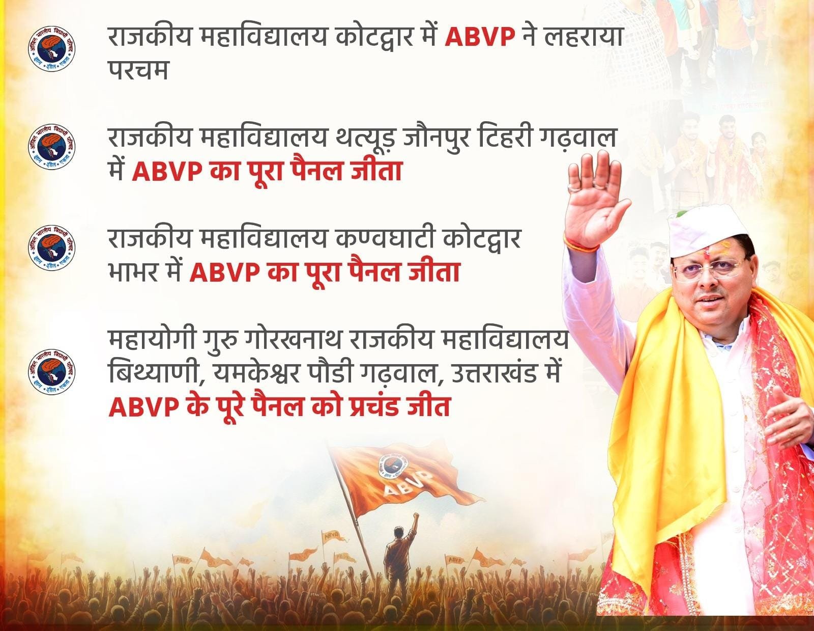 छात्रसंघ चुनाव परिणामों के बाद ABVP समर्थक कॉलेज कैंपसों में जश्न मना रहे हैं, जबकि विपक्ष बैकफुट पर नज़र आ रहा है। यह तस्वीर साफ़ करती है कि युवा धामी सरकार के साथ खड़े हैं और 2027 के राजनीतिक समीकरण पर भी इसका गहरा असर पड़ेगा।
