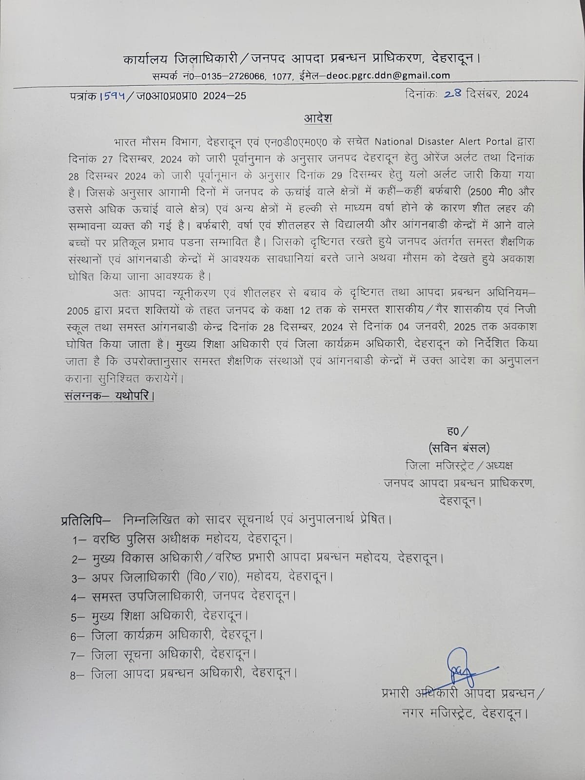 देहरादूनः जिलाधिकारी सविन बंसल ने जनपद के कक्षा 1 से कक्षा 12 तक के समस्त शासकीय / गैर शासकीय एवं निजी स्कूल तथा समस्त आंगनबाडी केन्द्र दिनांक 28 दिसम्बर, 2024 से दिनांक 04 जनवरी, 2025 तक अवकाश घोषित किया है। मुख्य शिक्षा अधिकारी एवं जिला कार्यक्रम अधिकारी, देहरादून को निर्देशित किया जाता है कि समस्त शैक्षणिक संस्थाओं एवं आंगनबाडी केन्द्रों में उक्त आदेश का अनुपालन कराने के दिए निर्देश।