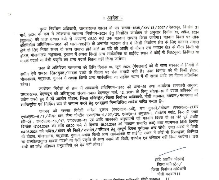 देहरादून : उत्तराखंड में तीन दिन शराब की दुकानें बंद रहेंगी। इसको लेकर राज्य मुख्य निर्वाचन अधिकारी ने मतदान से 48 घंटे से पहले से लेकर मतदान समाप्त होने की अवधि तक शराब की दुकानों को बंद रखने के निर्देश दिए हैं। यह भी स्पष्ट किया गया है कि इस अवधि में वाणिज्यिक व निजी संस्थान व भवन में शराब व मादक पदार्थ की बिक्री प्रतिबंधित रहेगी। प्रदेश में लोकसभा चुनाव के दृष्टिगत मतदान दिवस से 48 घंटे पहले व मतदान समाप्ति तक, यानी 17 अप्रैल से 19 अप्रैल शराब की दुकानें बंद रहेगी। मतगणना के दिन यानी चार जून को भी शराब की दुकानें बंद रहेंगी। इस अवधि में किसी भी होटल, रेस्टोरेंट, बार, दुकान आदि में भी शराब या अन्य मादक पदार्थ की बिक्री प्रतिबंधित रहेगी। प्रदेश में 19 अप्रैल को मतदान होना है। ऐसे में कानून व्यवस्था बनाने के लिए राज्य मुख्य निर्वाचन अधिकारी ने मतदान से 48 घंटे से पहले से लेकर मतदान समाप्त होने की अवधि तक शराब की दुकानों को बंद रखने के निर्देश दिए हैं। यह भी स्पष्ट किया गया है कि इस अवधि में वाणिज्यिक व निजी संस्थान व भवन में शराब व मादक पदार्थ की बिक्री प्रतिबंधित रहेगी।