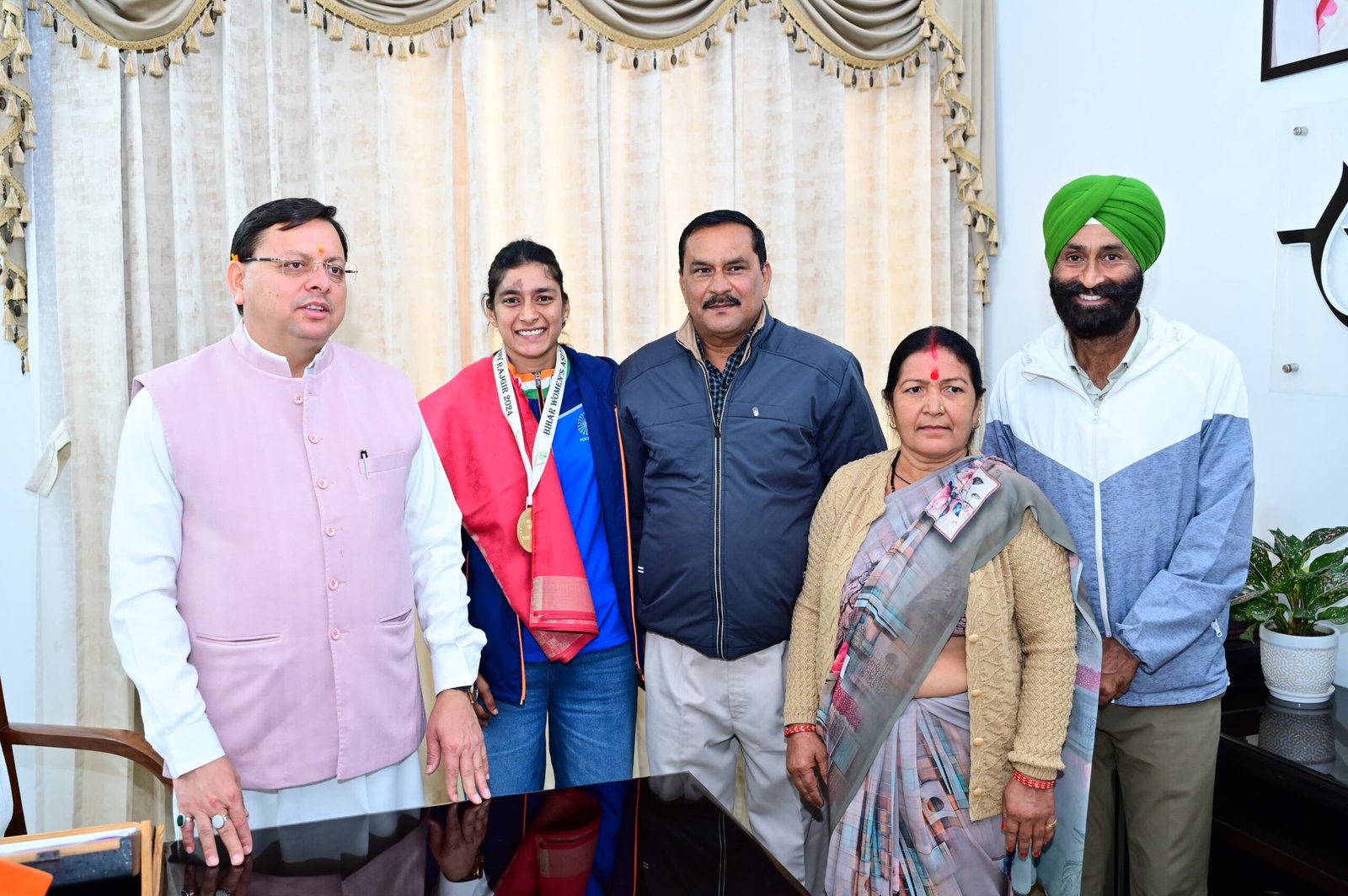 देहरादून : मुख्यमंत्री पुष्कर सिंह धामी से रविवार को मुख्यमंत्री आवास में एशियाई चैंपियंस ट्रॉफी विजेता महिला हॉकी टीम की सदस्य हरिद्वार निवासी मनीषा चौहान ने शिष्टाचार भेंट की। इस दौरान मनीषा के साथ उनके माता पिता एवं कोच भी मौजूद रहे। मुख्यमंत्री ने एशियाई चैंपियनशिप में मनीषा के शानदार प्रदर्शन के लिए उन्हें बधाई दी। उन्होंने कहा मनीषा ने उत्तराखंड के साथ पूरे देश का मान सम्मान और स्वाभिमान बढ़ाया है। मुख्यमंत्री ने मनीषा को उज्ज्वल भविष्य हेतु शुभकामनाएं दी।