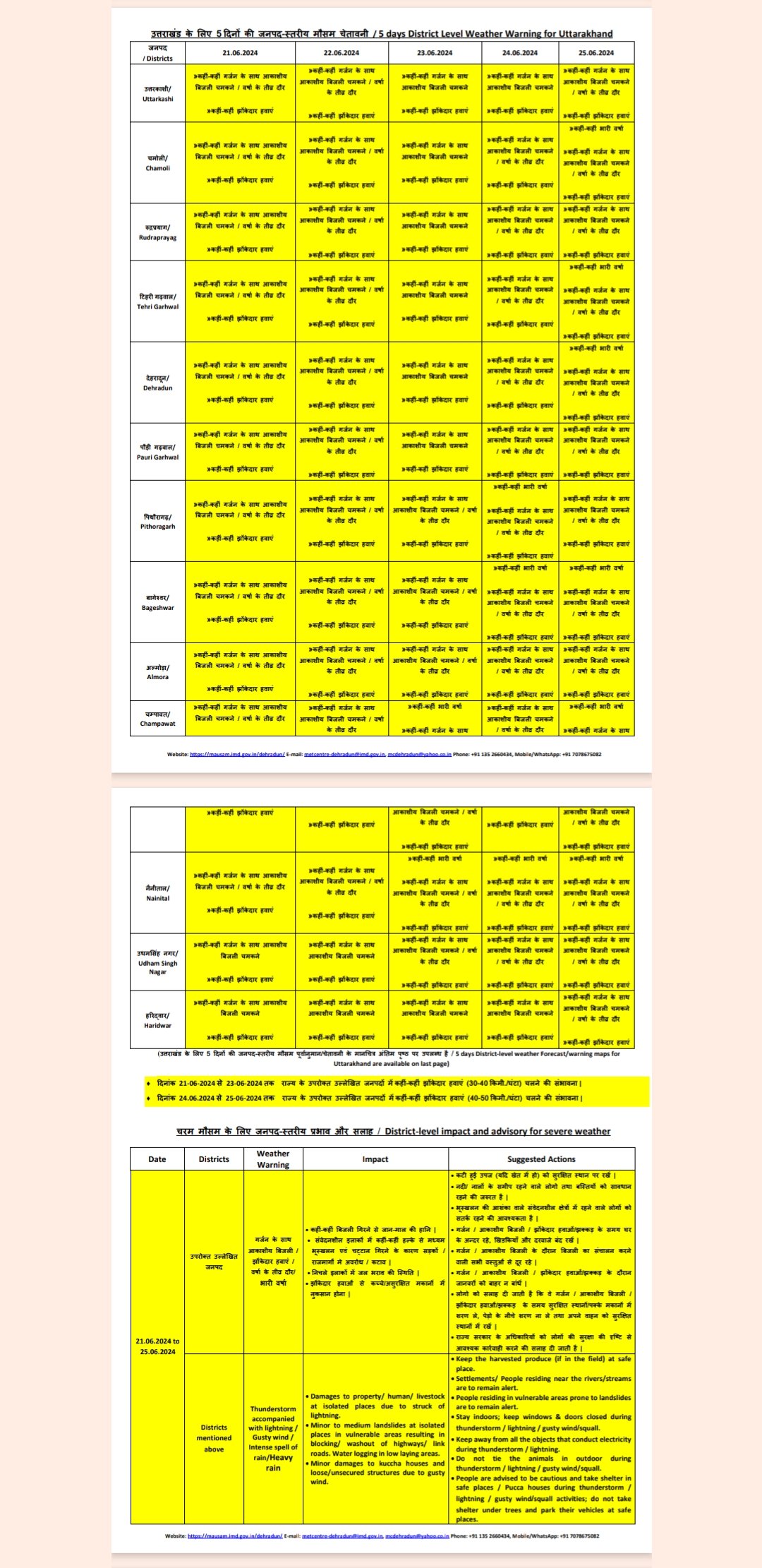 राजधानी देहरादून से लेकर पहाड़ के लगभग सभी जिलों में रुक-रुक कर बारिश का सिलसिला जारी है। इस बीच मौसम विभाग ने अलर्ट जारी किया है। मौसम विभाग के अनुसार 21 जून से लेकर 25 जून तक प्रदेश के लगभग सभी जिलों में बारिश का सिलसिला लगातार जारी रहने का अनुमान लगाया गया है।