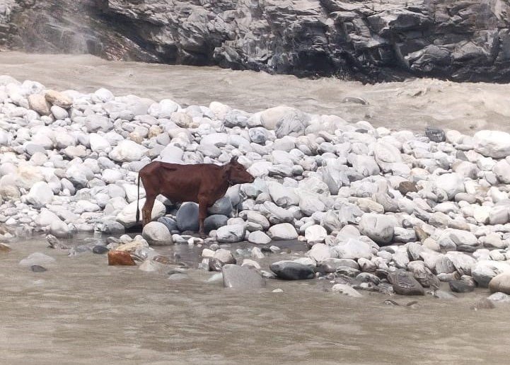 आपदा प्रबंधन अधिकारी नंद किशोर जोशी ने बताया कि मंगलवार को आपदा कंट्रोल रूम को पीपलकोटी में टीएचडीसी के निकट अलकनन्दा नदी के बीच बने टापू पर एक गाय फंसी होने की सूचना मिली। बताया गया कि नदी का जल स्तर अधिक होने के चलते गाय सुरक्षित तट पर नहीं पहुंच पा रही है। जिस पर तत्काल यहां डीडीआरएफ, स्थानीय पुलिस, टीएचडीसी, एचसीसी एंव सीआईएसएफ की टीमों को गाय को रेस्क्यू करने के लिए भेजा गया। लेकिन काफी मशक्कत के बाद भी गाय को नहीं निकाला जा सका। जिस पर बुधवार को गाय को सुरक्षित रेस्क्यू करने के लिए एनडीआरएफ गौचर व प्रथम वाहिनी आईटीबीपी ज्योतिर्मठ से अनुरोध किया गया। लेकिन दूसरे दिन भी नदी का बहाव अत्याधिक होने के चलते गाय को रेस्क्यू नहीं किया जा सका। जबकि गुरुवार को आईटीबीपी ज्योतिर्मठ, स्थानीय पुलिस, टीएचडीसी, एचसीसी, सीआईएसएफ की ओर से रेस्क्यू अभियान चलाया गया। जिसके बाद आईटीबीपी की टीम के विशेष प्रयास से गाय को सकुशल रेस्क्यू कर लिया गया है। इस दौरान रेस्क्यू टीम में आईटीबीपी के सुनील कुमार, सुभाष चन्द, शीशपाल, वेद प्रकाश, डीडीआरएफ, पुलिस, टीएचडीसी, एचसीसी, सीआईएसएफ, एनडीआरएफ के कार्मिक मौजूद थे।