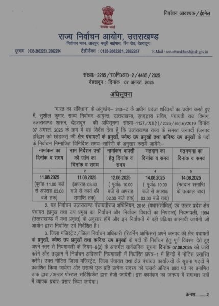 देहरादून : राज्य निर्वाचन आयोग, उत्तराखंड ने प्रदेश के समस्त जनपदों (हरिद्वार को छोड़कर) की क्षेत्र पंचायतों के प्रमुखों, वरिष्ठ उप प्रमुखों तथा कनिष्ठ उप प्रमुखों के पदों के लिए निर्वाचन कार्यक्रम की घोषणा कर दी है। निर्वाचन आयुक्त सुशील कुमार ने संविधान के अनुच्छेद 243-T के अंतर्गत शक्तियों का प्रयोग करते हुए यह अधिसूचना जारी की।