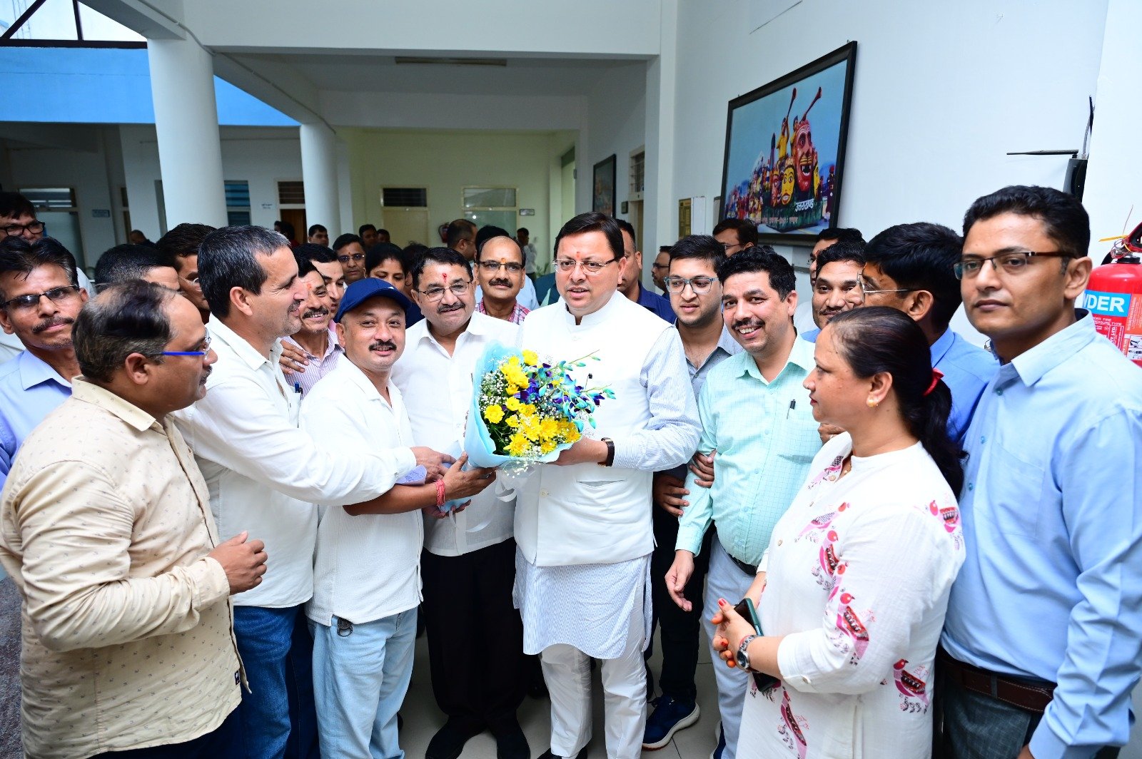 सूचना कर्मचारी संघ के पदाधिकारियों ने मुख्यमंत्री से भेंट कर सौंपा मांगों से संबंधित ज्ञापन पत्र, सूचना निदेशालय आने पर संघ ने सीएम धामी का किया स्वागत