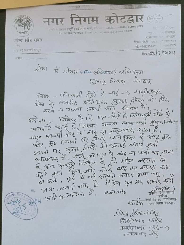 कोटद्वार। नगर निगम के वार्ड नंबर 9, काशीरामपुर के निवर्तमान पार्षद प्रवेंद्र सिंह रावत काशीरामपुर नजीबाबाद रोड स्थित पनियाली गधेरे में क्षतिग्रस्त सुरक्षा दीवारों की मरम्मत एवं पनियाली गधेरे की सफाई की मांग की गई, गत वर्ष पनियाली गधेरे में आई भीषण आपदा के कारण गधेरे में मलवा आदि जमा है, जिस कारण गधेरे का स्तर बढ़ गया है और आबादी क्षेत्र को खतरा बना हुआ है खतरे की जद में काशीरामपुर, बालासौड आदि गांव है यदि समय पर बरसात से पहले पनियाली गधेरे की सफाई नहीं हुई तो बाढ़ का खतरा ज्यादा बढ़ जाएगा । बताया कि जगह-जगह पिछले वर्ष दीवारें भी क्षतिग्रस्त हो गई है, सिंचाई विभाग के अभियंता सिंचाई खंड कोटद्वार को ज्ञापन दिया गया और मांग की गई कि शीघ्र दीवार निर्माण कार्य एवं गधेरे की सफाई की जाए ।