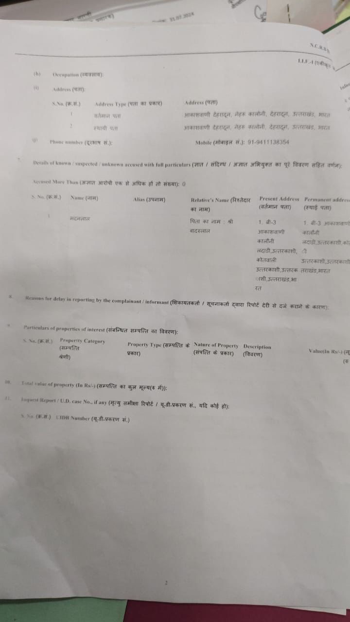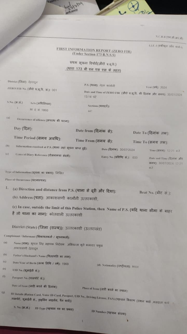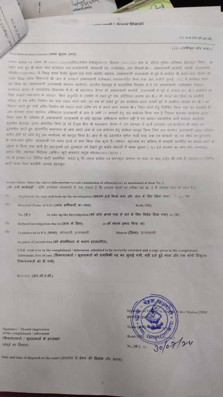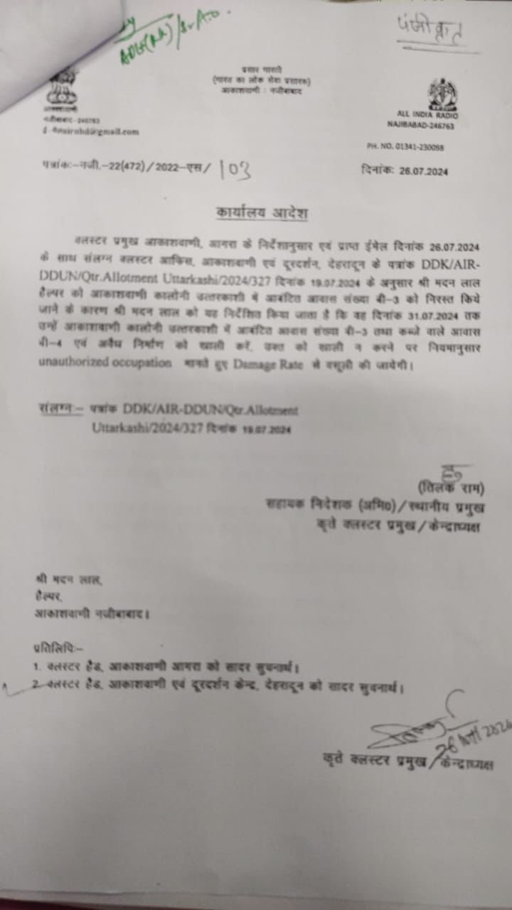 एफआईआर के अनुसार वर्ष 2012 में उत्तरकाशी में आई आपदा के बाद आकाशवाणी कालोनी , लदाडी उत्तरकाशी में अन्य अवैध कब्जाधारियों में से एक विभागीय कर्मचारी मदनलाल ने आवंटित आवास के अतिरिक्त एक अन्य आवास पर कब्जा किया हुआ है और परिसर में अवैध निर्माण कर गाय पालन का कार्य उनके द्वारा किया जा रहा है। इस पर कार्रवाई करते हुए उनका आवंटन विभाग ने निरस्त कर दिया है।