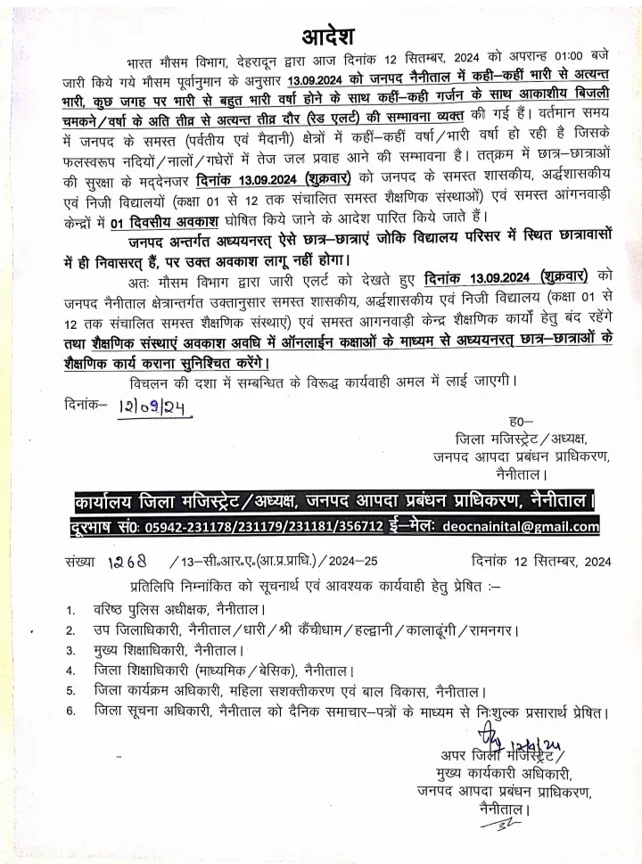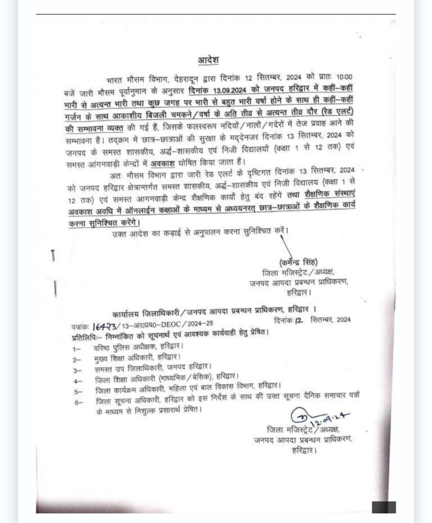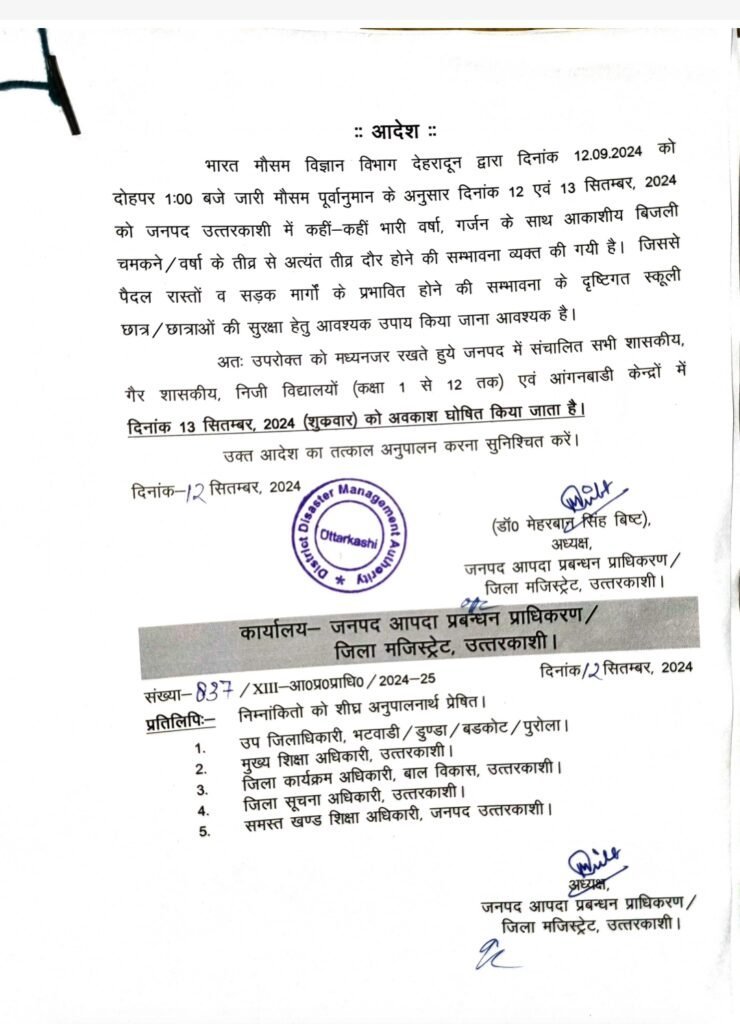 देहरादून : मौसम विभाग के भारी बारिश के अलर्ट को देखते हुए उत्तरकाशी, नैनीताल और हरिद्वार जिला प्रशासन ने सरकारी व गैर सरकारी विद्यालयों में एक से 12वीं तक की कक्षाओं में अवकाश घोषित कर दिया है।  आंगनबाड़ी केंद्रों में भी अवकाश रहेगा। मौसम विज्ञान केंद्र के निदेशक बिक्रम सिंह ने बताया कि उत्तराखंड में मानसून की विदाई की आधिकारिक तिथि 15 सितंबर है। इससे पहले प्रदेश के पर्वतीय जिलों के साथ मैदानी इलाकों में भी कहीं-कहीं भारी बारिश होने के आसार हैं। 14 सितंबर तक संवेदनशील इलाकों में रहने वाले लोगों को अधिक सतर्कता के साथ रहने की जरूरत है। उनका कहना है कि आवश्यक न हो, तो यात्रा करने से भी बचें।